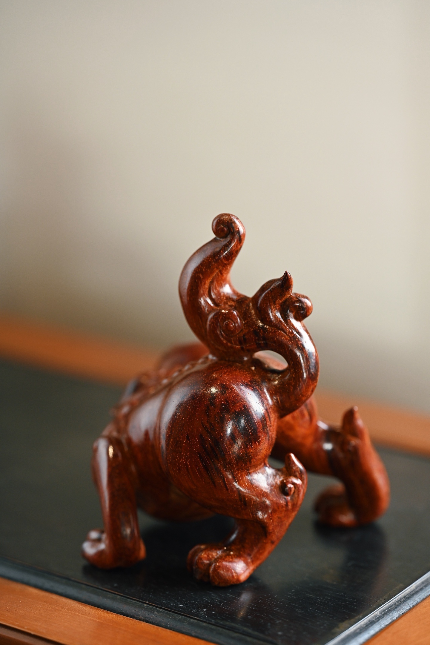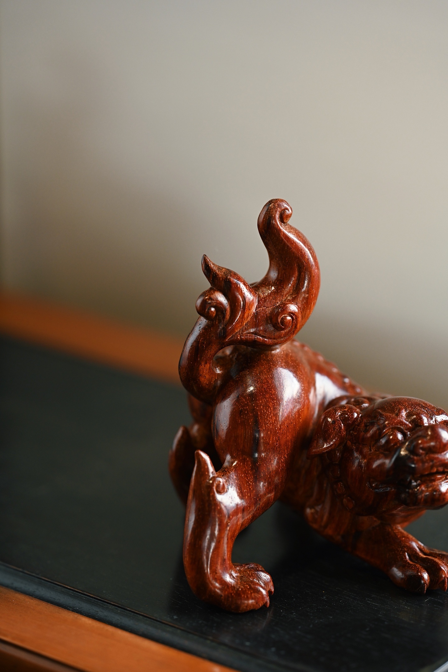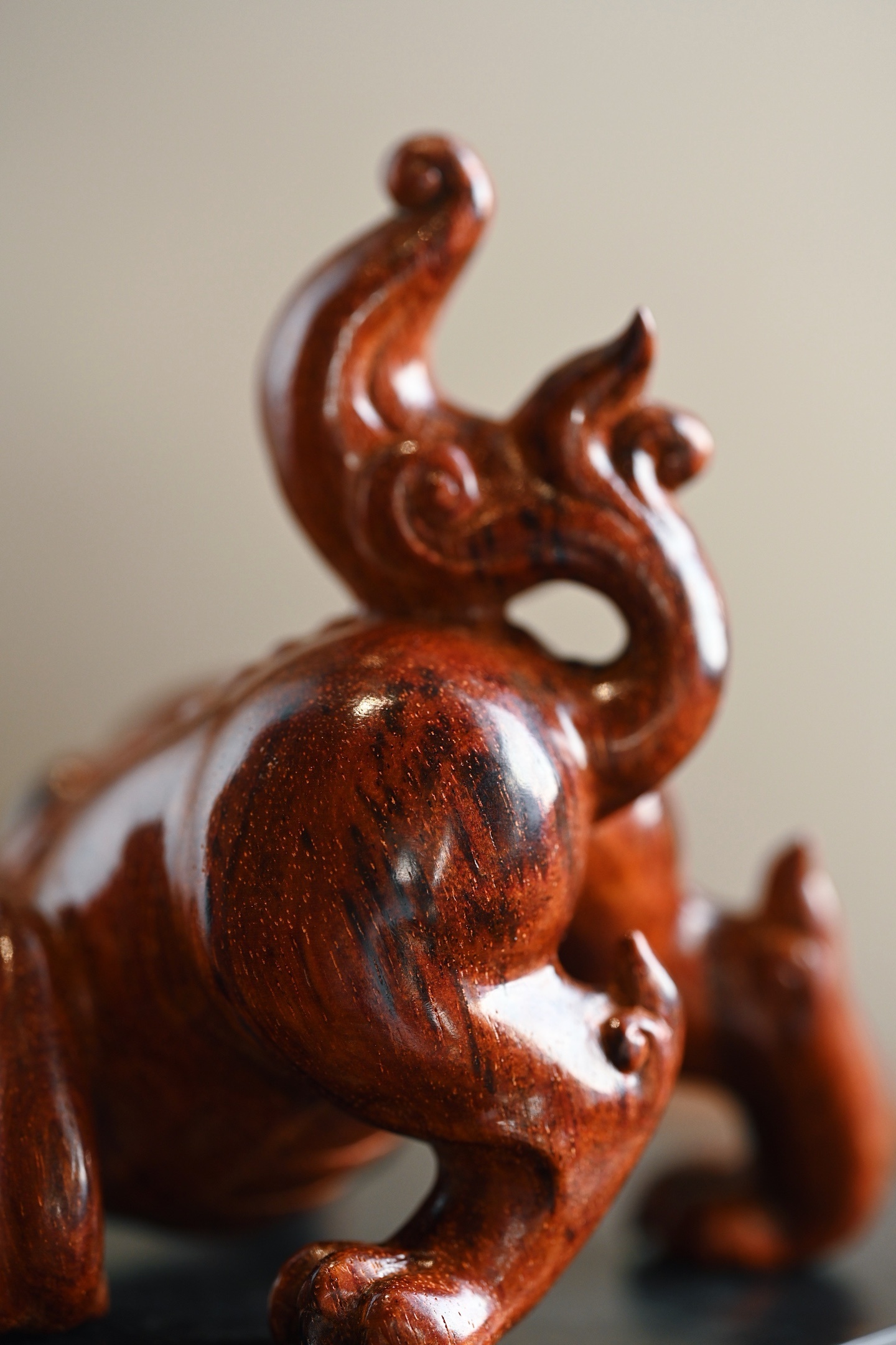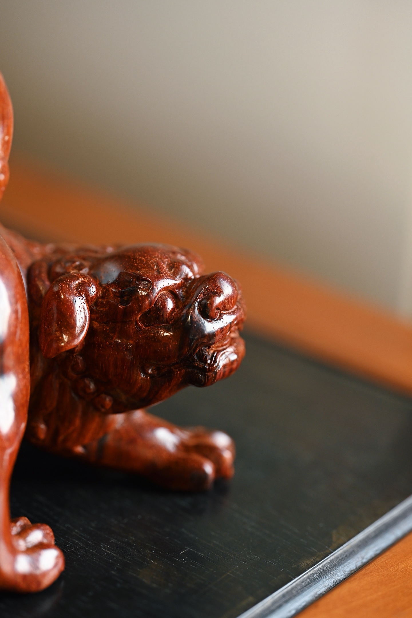 小叶紫檀 | 瑞狮整料雕刻,线条流畅,刀法张弛有度,狮子造型圆润饱满,灵气十足,鬃毛卷曲自然,置于案头赏玩,彰显不凡贵气。9.2*9.2*10cm 160g