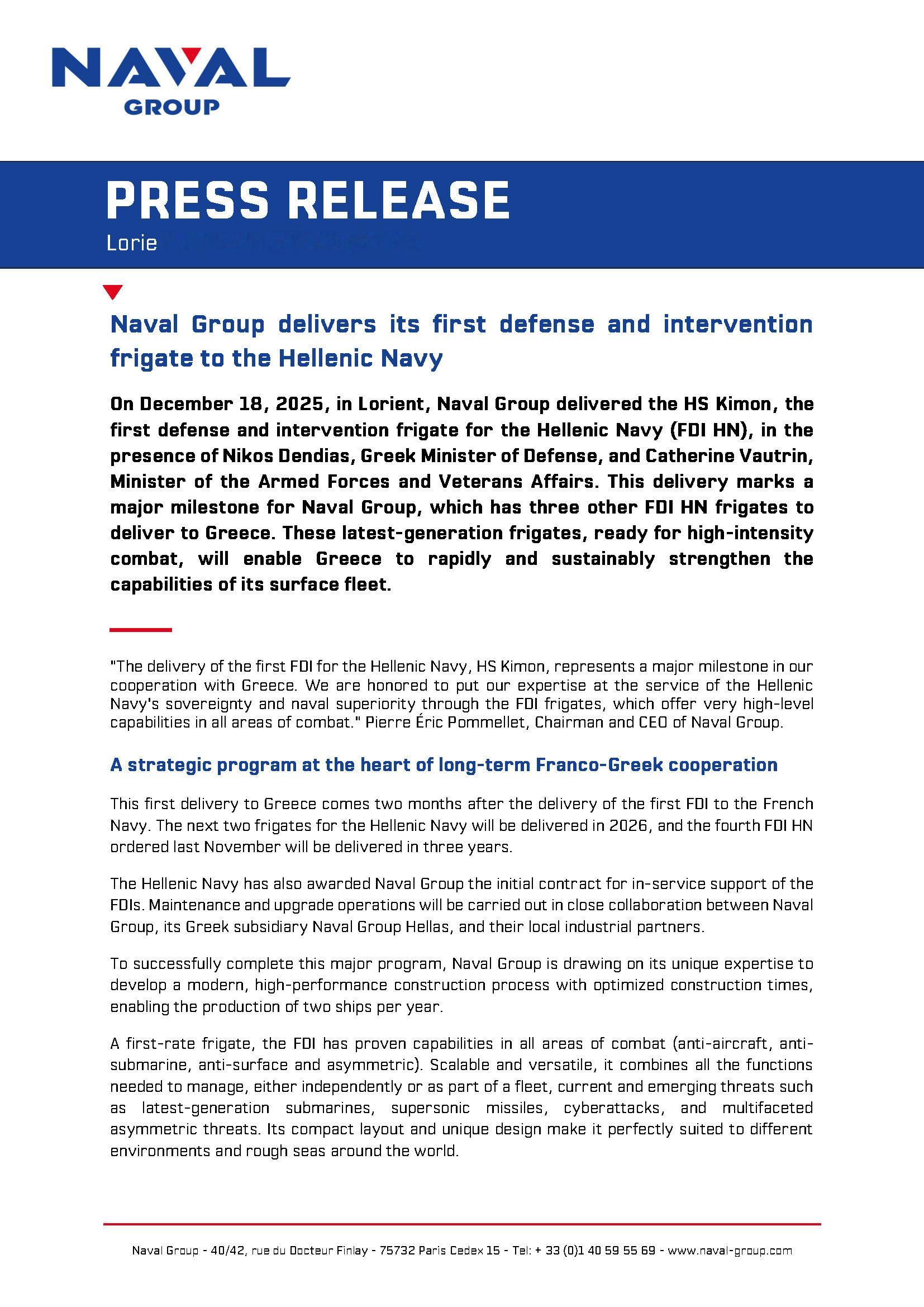 希腊首艘FDI——HS Kimon (F-601) 交付