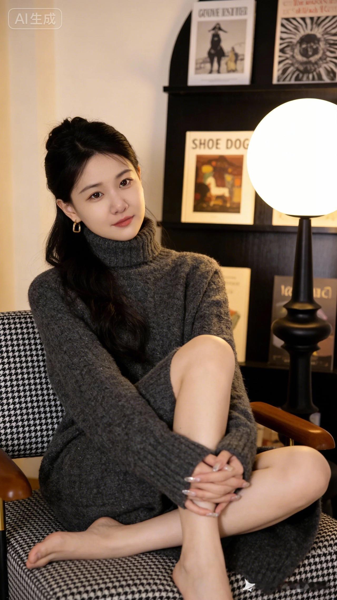 这姑娘在沙发上翘着腿坐着,祝她快乐每一天。