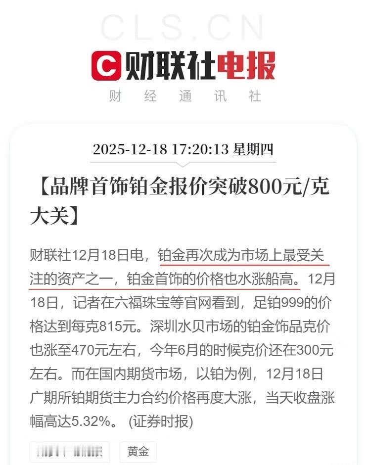 品牌首饰铂金报价突破800元/克大关。 去年就感觉铂金要大涨,研究了很久发现盘子小门槛高投资条子假货多,还有就是渠道特别少,普通人很难去玩这个。所以买了两件喜欢的首饰。