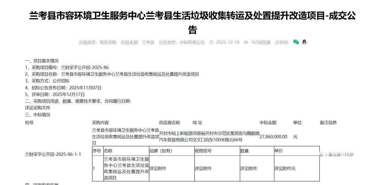 兰考县生活垃圾收集转运及处置提升改造项目-成交公告,金额2786万元