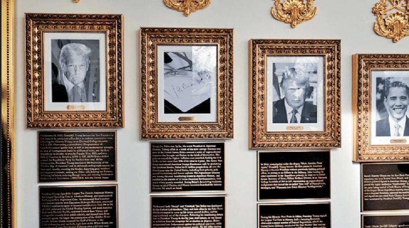 今年9月,美国白宫在椭圆形办公室与南草坪间的走廊设立“总统星光大道”,悬挂历任总统肖像,唯独年初卸任的拜登仅以自动签名笔代替画像。时隔三个月,该走廊近日新增铜制铭文,对每位总统附上简短评价,内容因充满政治倾向引发舆论争议。 据《华盛顿邮报》等媒体报道,新增铭文的行文风格与前总统特朗普在社交平台的发文相似,近代多位民主党籍前总统几乎均被以批判性语句描述。其中,拜登被称为“打瞌睡的拜登,美国史上最差总统”,并指其受激进左翼操控,导致通胀飙升、非法移民涌入,“将美国推向毁灭边缘”。拜登也是唯一没被摆上肖像的前任总统,取而代之的是一张自动签名机照片。