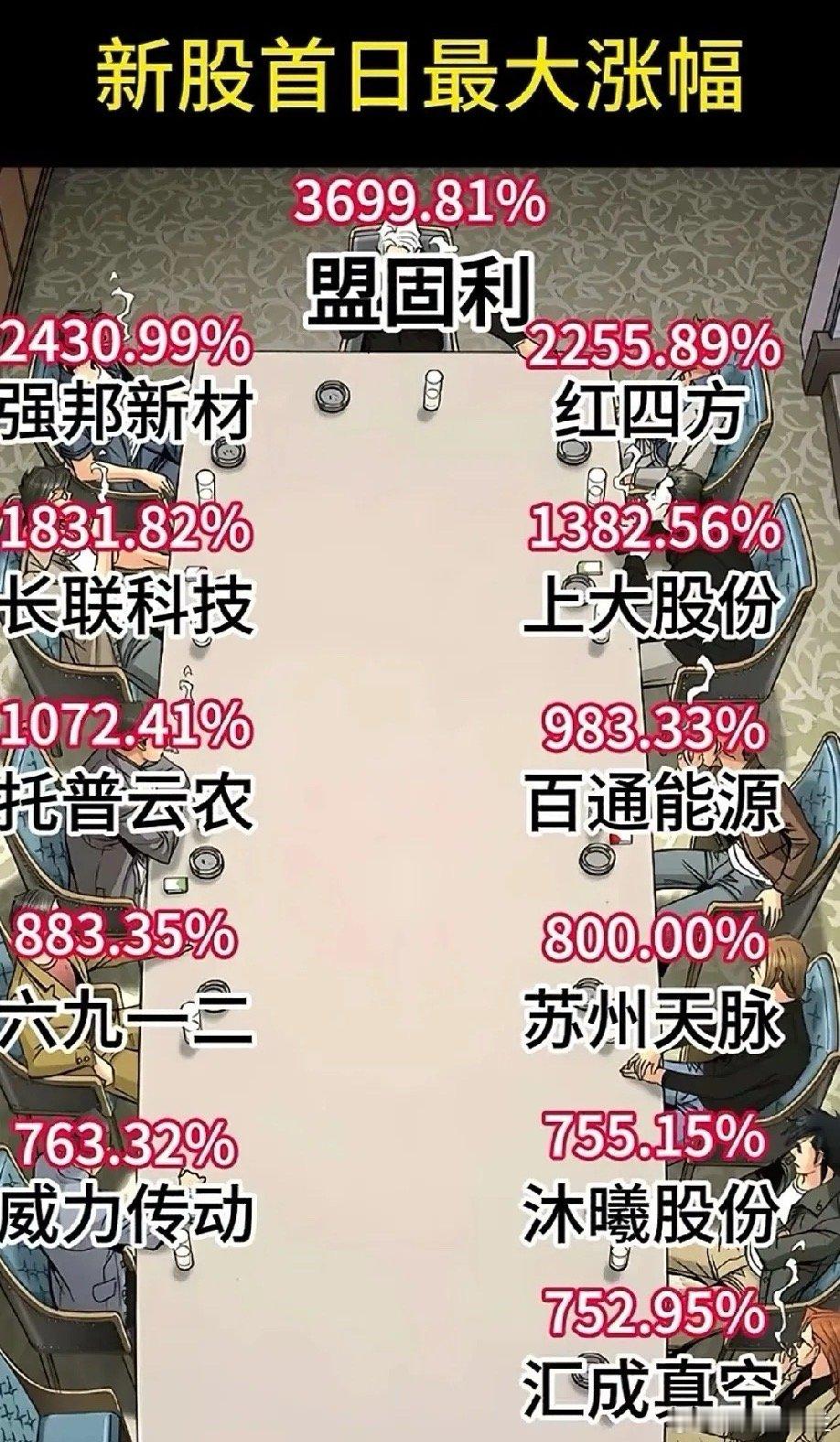 新股上市首日涨幅排行榜1.盟固利涨幅达36倍2.强邦新材涨幅达24倍3.红四方涨幅达22倍4.长联科技涨幅达18倍5.上大股份涨幅达13倍......11.沐曦股份涨幅达7.5倍沐曦股份上市,葛老板狂赚220亿,新股上市简直成为了资本的狂欢,而动辄3000亿的估值直接把市场的资金吸走,导致其他股票大跌,苦了散户,只能说国内就是做一级市场相对容易,因为二级市场永远有人接盘,毕竟中国的股民是世界上最伟大的股民,几十年如一日的亏钱,等解套,却始终满怀信心,支持国家做大做强资本市场,最终科技盛宴后,国家强、股东富、股民继续养。股票财经新股上市行情新股暴涨