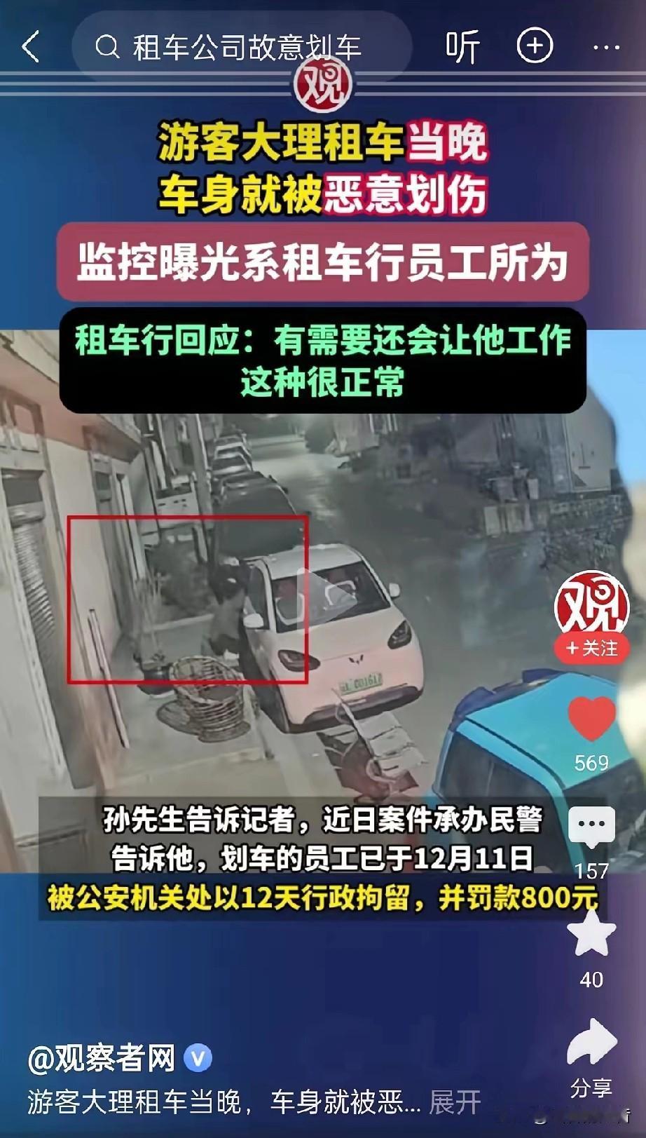 游客在大理租车游玩,当天晚上车身就被恶意划伤。报警后,调取监控,发现划车的竟然是租车行员工。 警察对该员工拘留11天,罚款800。但是由此可见,绝非该员工自愿行为,肯定是租车行老板指使。 谁会跟一辆陌生的租车过不去?一个拿着微薄薪水的员工,又何苦冒着被拘留的风险,去划坏自家车行的车?答案其实藏在游客异地维权的痛点里——这根本不是一时冲动的恶意,而是一场早有预谋的“定损生意”! 想想那位游客的心情吧:带着对大理风花雪月的期待,租辆车想慢悠悠逛遍古城街巷、洱海西岸,结果晚上回到住处,看到车身一道长长的划痕,瞬间浇灭所有兴致。异地他乡,报警、调监控、做笔录,原本轻松的旅途变成了折腾人的维权路,换谁能不窝火?更让人膈应的是,划伤车辆的不是路人,竟是租车行自己人,这背后的算计,比划痕更伤人心。 为什么说老板大概率是幕后推手?稍微琢磨就懂其中的门道。租车行的盈利里,除了租金,“车辆定损”早已成了不少黑心商家的灰色收入。游客租车时,车身哪怕有一点小划痕,商家都会狮子大开口,少则几百多则上千,美其名曰“维修折旧费”。而异地游客大多没时间耗着维权,往往只能自认倒霉掏钱了事。这位员工敢这么做,无非是摸准了游客“多一事不如少一事”的心态,背后若没有老板的默许甚至明确指使,他怎么可能敢拿自己的工作和自由冒险? 更讽刺的是,警方的处罚看似有了结果,却只打了“执行者”,没揪出“始作俑者”。员工被拘留11天、罚款800,可老板呢?大概率还在背后偷笑,这笔“定损费”最终还是会落到游客头上,而员工不过是他赚钱路上的一颗棋子。这种“抓小放小”的处理方式,根本治不了租车行业的乱象,反而会让更多黑心商家有恃无恐——反正风险由员工承担,利润却归自己,何乐而不为? 我身边就有朋友遭遇过类似的事:去年去某旅游城市租车,还车时商家突然指着车门上一道极浅的划痕,要求赔偿2000元。朋友明明记得取车时这道划痕就存在,可租车合同上没写清楚,商家又拒不承认,最后为了赶高铁,只能花800元了事。这种“碰瓷式定损”,早已成了旅游租车行业的沉疴,不仅坑了游客的钱,更寒了大家的心,也毁了旅游城市的口碑。 大理作为国内顶流旅游城市,靠的是苍山洱海的美景和淳朴的民风吸引游客,可这样的黑心租车行,却像一颗老鼠屎坏了一锅汤。游客来这里是为了放松心情,不是为了遭遇“套路”;城市想要长久发展,靠的是诚信经营,不是靠坑蒙拐骗。如果任由这种乱象滋生,只会让越来越多的游客望而却步,最终损害的是整个旅游产业链的利益。 其实要整治这种乱象并不难:一方面,监管部门要加大查处力度,不仅要处罚划车的员工,更要深挖背后的商家责任,一旦查实恶意定损,就该从重处罚,甚至吊销营业执照,让黑心商家付出惨痛代价;另一方面,游客租车时也要多留个心眼,取车时仔细检查车身,用手机拍下所有划痕和瑕疵,明确写进合同,遇到不合理收费时,坚决拿起法律武器维权,不要轻易妥协。 旅游本该是一场双向奔赴的美好,游客带着期待而来,城市用诚信和温暖回应。可这些黑心租车行的行为,却让这份美好打了折扣。希望这次的划车事件,能成为整治旅游租车乱象的一个契机,让更多商家明白,诚信才是长久之计,坑蒙拐骗终会自食恶果。 各位读者你们怎么看?欢迎在评论区讨论。