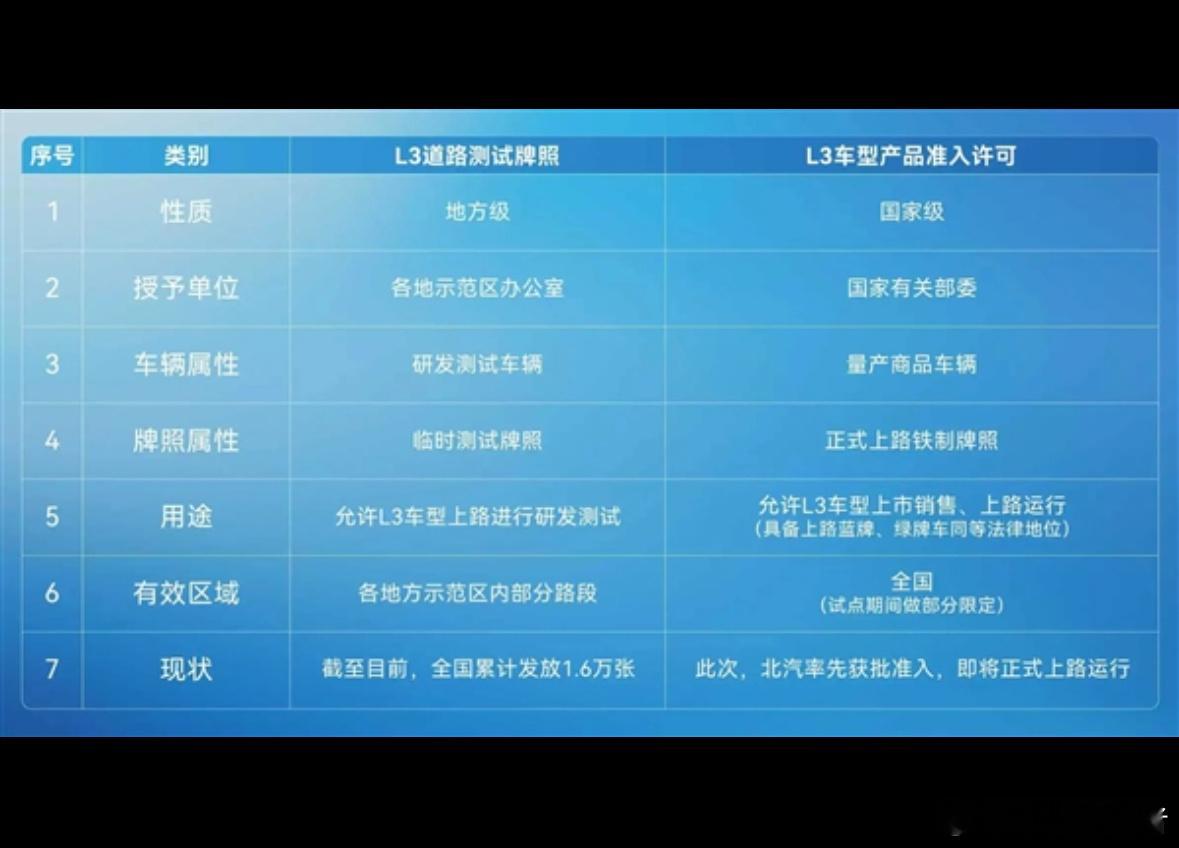 北汽详解L3自动驾驶“测试牌照”和“准入许可”区别:不是一个量级!!别在擦边,忽悠老百姓了好不好!懂不懂法!这两天陆续有车企发布称,自己也已经获得了L3“测试牌照”!!并积累了非常多的实测数据,在L3级自动驾驶的推进过程中,两种官方许可常被混淆:一是由地方相关机构发放的“道路测试牌照”,二是此次由国家有关部委发放的“产品准入许可”。北汽昨晚发文进行了阐释。而产品准入许可则相当于“毕业证”,意味着量产商品车获得了在全国特定条件下上市销售的资格,这是一种国家级别的认证,由国家有关部委批准,难度系数极高!此次,北汽率先获得准入许可,标志着中国自动驾驶正式从“测试验证”阶段迈入“准入应用”新阶段。
