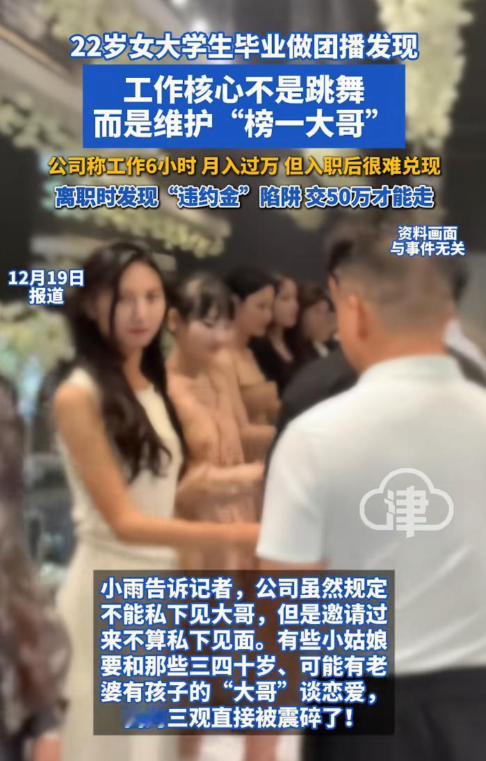 “团播中跳舞不是最重要的,维护好榜一大哥才是正事。”这才是团播跳舞的真相。 22岁的应届毕业生小雨找了一份团播跳舞的工作,对方说待遇很好,每天工作6小时,收入上万,小雨很心动,但是做了3个月,发现事情不是那么一回事啊。 团播大家都知道,就是一群漂亮的小哥哥小姐姐给大家免费跳舞看,小雨发现,她这工作中,跳舞不止最重要的,和榜一大哥维护好关系才是正事啊。 直播间榜一大哥会打赏,打赏才有收入啊,他们跳舞为了啥?目的就是吸引榜一大哥打赏。 为了让榜一大哥持续打赏,小雨需要和榜一大哥联络,互动,维护好关系。在公司邀请榜一大哥们来参加活动的线下活动,小雨等主播需要和这些中年大叔们谈恋爱,哪怕对方已经有家庭有孩子。 小雨接受不了,想要离职,结果发现当初签订的合同里,如果违约要赔偿50万,简直太坑人了。 各位小年轻们,找工作要看准啊,网络上很多人说钱容易赚,其实坑更多。