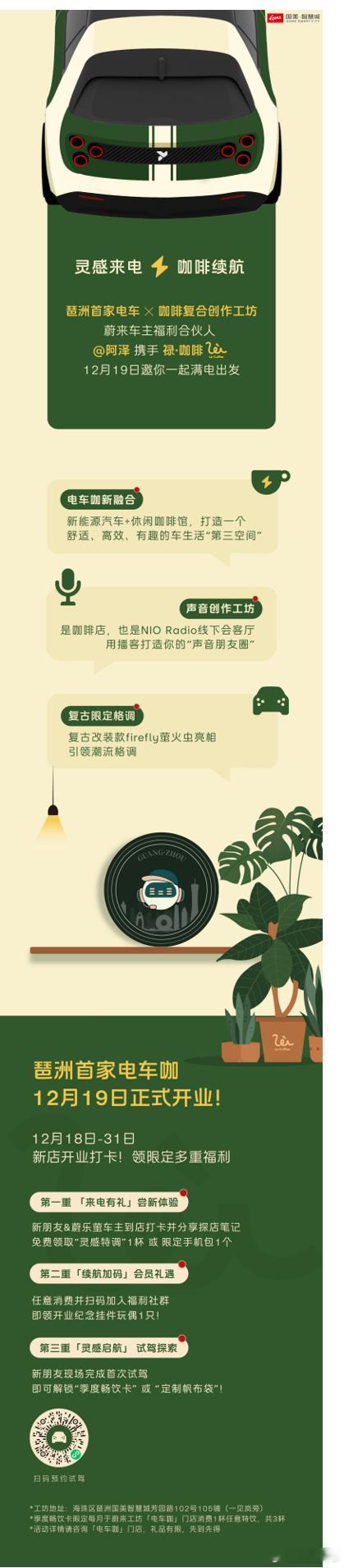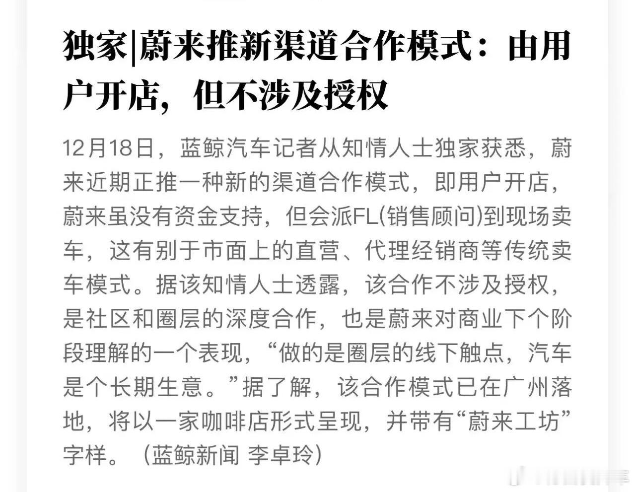 蔚来工坊这项目在广州试点应该有一阵了,之前是快闪模式,昨天正式推出挂牌门店,核心还是低成本的下沉、触达更多的用户,在销售渠道方面蔚来还是比较敢于尝试的,之前成立行销团队,现在又有合作工坊店。总得来说,一切都是为了卖车、为了盈利!蔚来新能源汽车