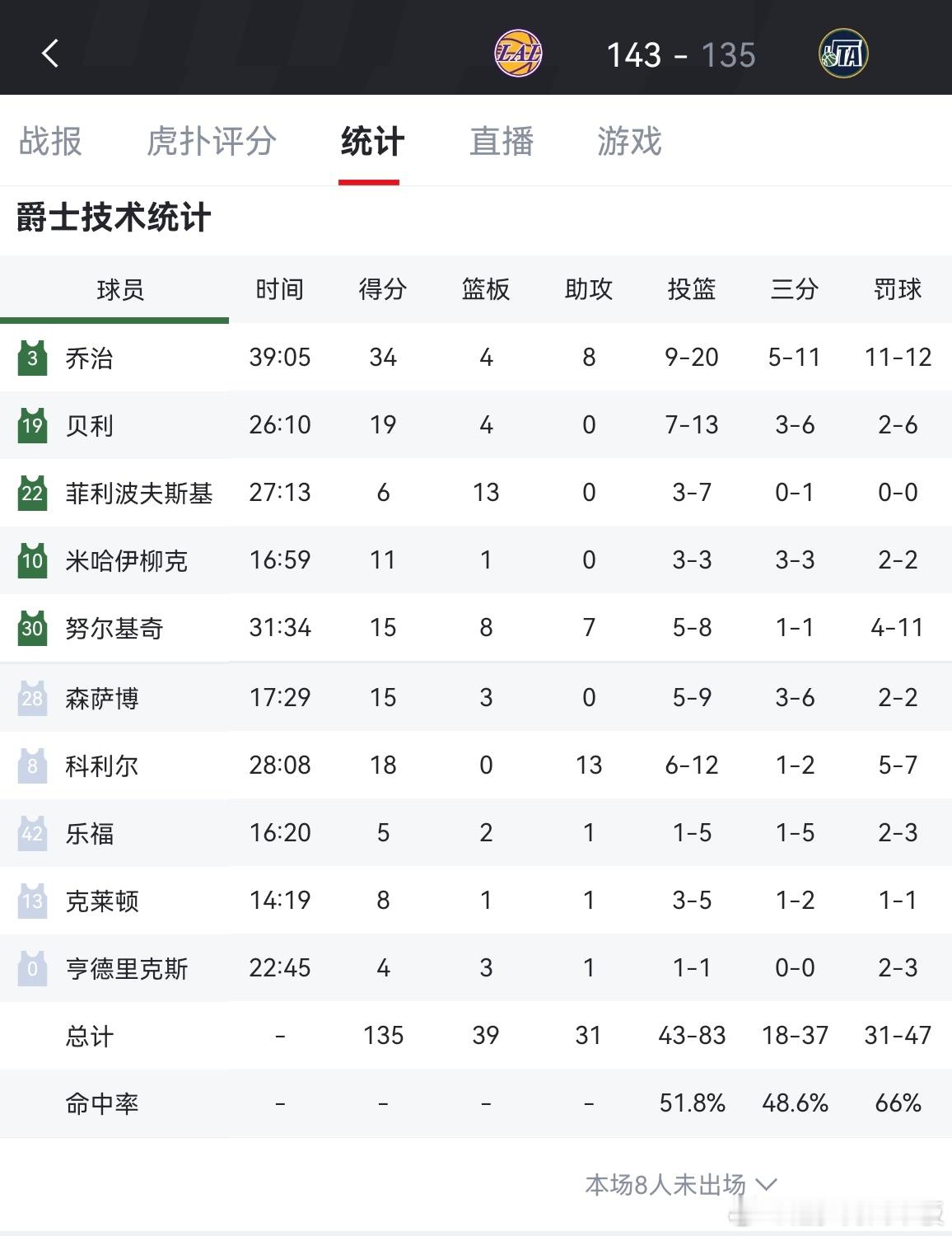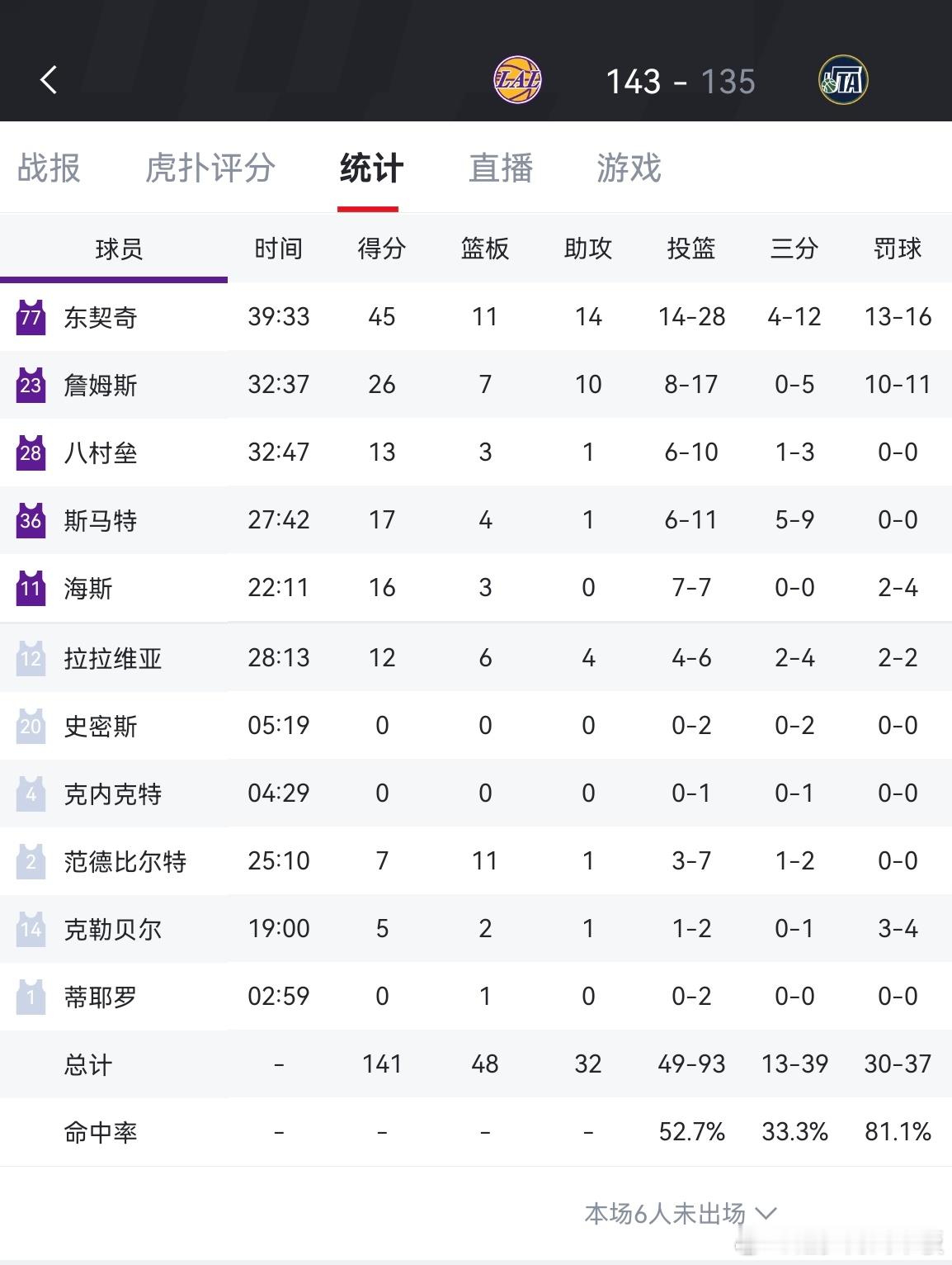 湖人143-135客场战胜爵士,如何评价这场比赛东契奇45分11板14助攻,詹姆斯26分7板10助,斯玛特17分湖人vs爵士