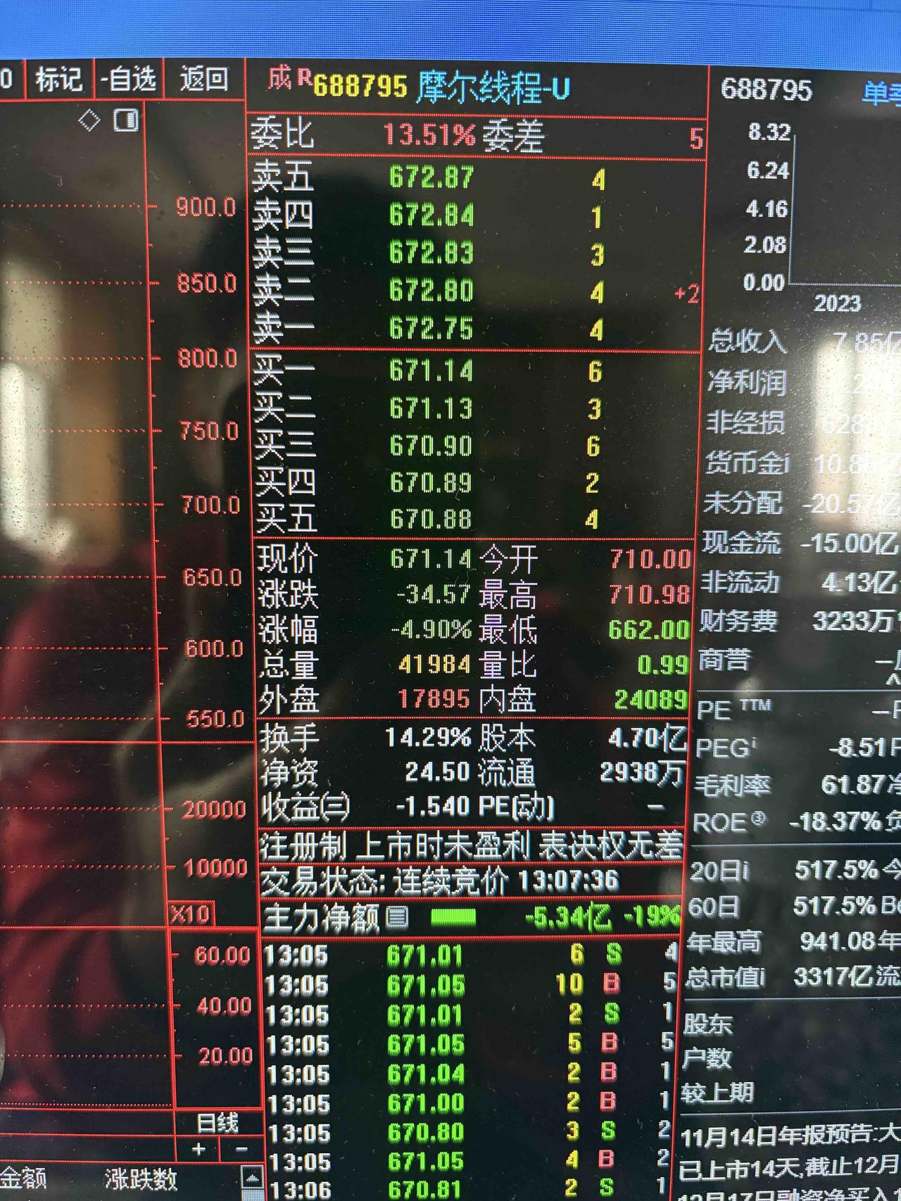 现在的AI芯片股票炒作有多疯狂?寒武纪、摩尔线程、沐曦股份、壁仞科技炒作行情完全脱离公司基本面,这几个公司的股票居然对标美国的英伟达公司,我是觉得你何德何能凭什么能够对标别人的公司,举例来说摩尔线程营收仅7.85亿元,归母净利润亏损7.24亿元,基本每股收益-1.81元,连续多年处于亏损状态,四家企业的总亏损达164亿元。目前四家公司的 市值 达到 了 1.5万 亿能支持你的股价吗?今天摩尔线程大跌五个点从940元高位跌到662元,就算再跌一半,我觉得价格也太高了。他现在股票价格吞掉了未来20年的盈利,创新低可以遇见的事情。建议广大股民千万不要去炒这样的股票。