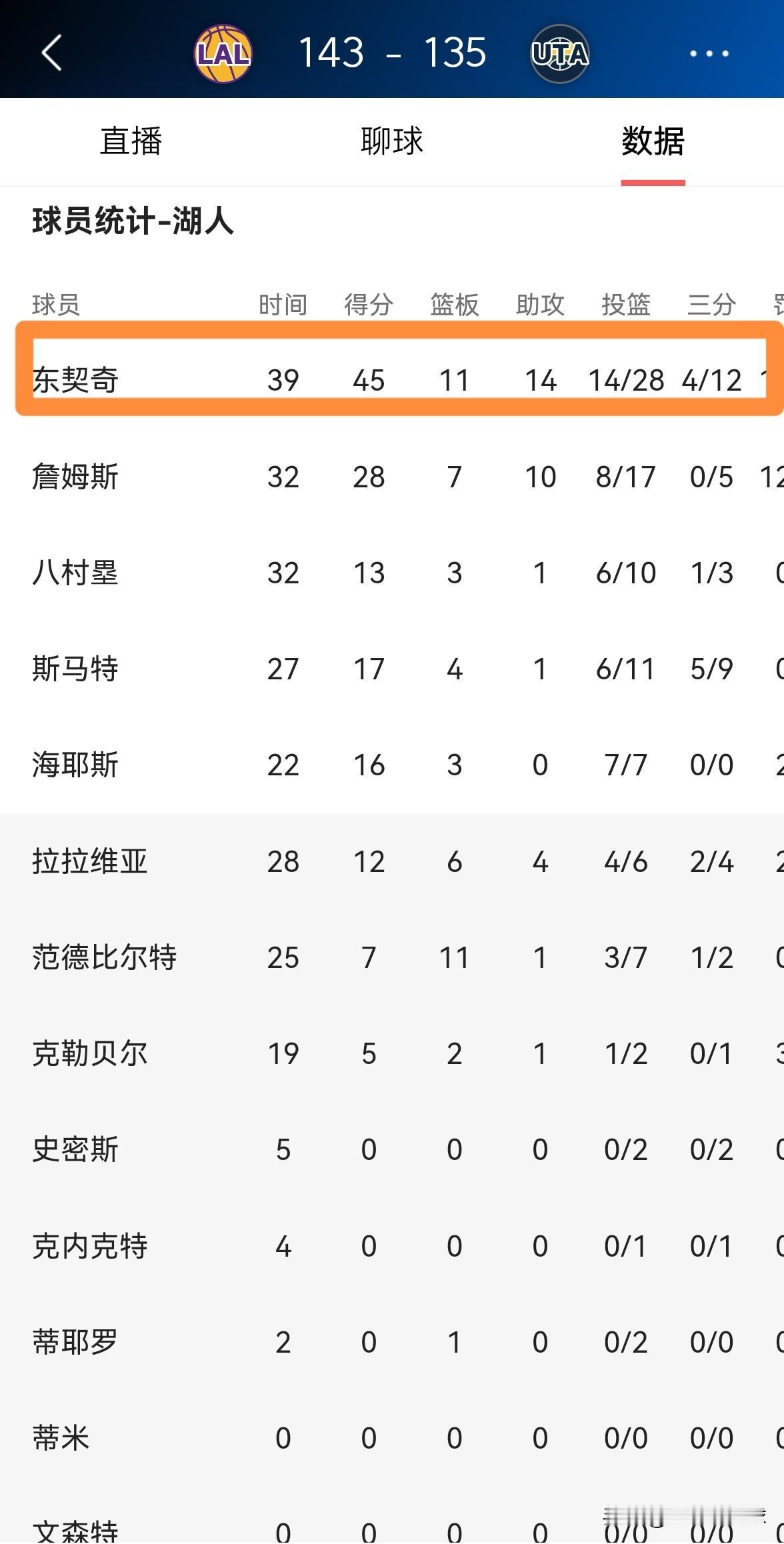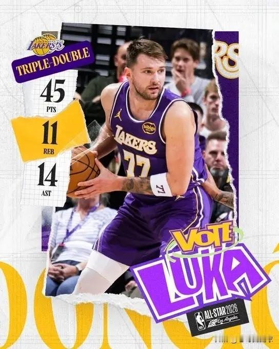 湖人官方真是太偏爱当家球星东契奇了!今天湖人在客场以143:135击败爵士,本场比赛东契奇狂砍45分11篮板14助攻,成为了球队获胜的大功臣。比赛结束以后,湖人官方专门更新社媒晒出了一张东契奇本场比赛的数据海报,并配文道:“湖人生涯的第一个40+三双。” 由此可见湖人对东契奇是多么的偏爱,每当东契奇打出炸裂的表现时,湖人官方都会更新社媒进行宣传。