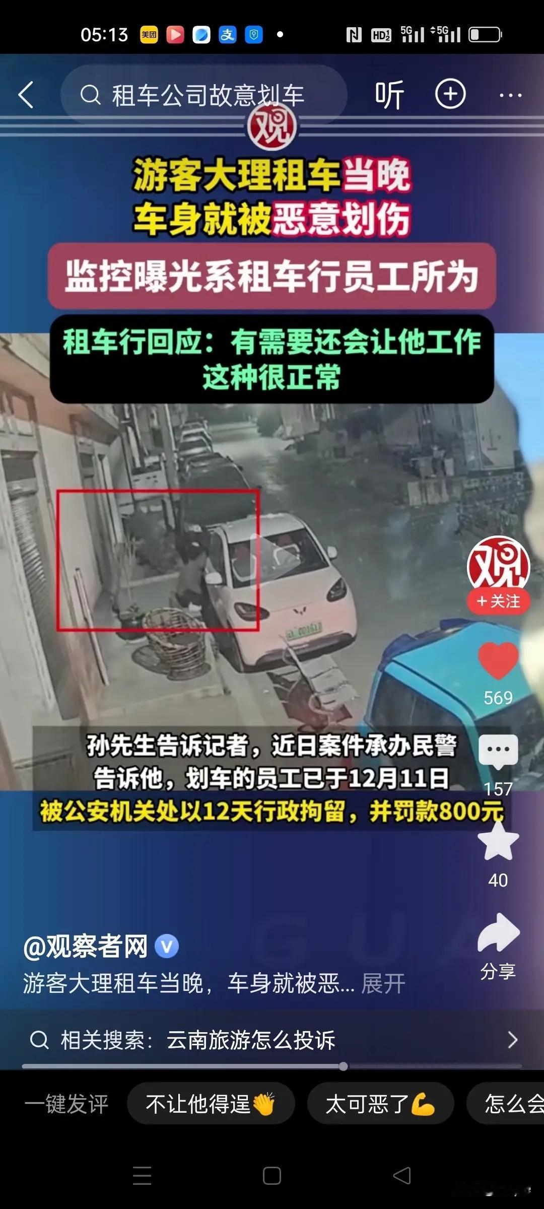 大理租车这波操作太恶心了! 员工深夜按GPS定位找车划刮,还车时转头索赔600元,这哪是租车,分明是精心设计的“碰瓷”陷阱! 说这是员工个人行为谁信? 精准定位、划车位置刚好是验车重点,还车时亲手“执法”索赔,背后没老板授意才怪。这种套路早不是新鲜事,本质就是利用游客没证据、怕麻烦的心理敲诈,既坑了钱,更寒了游客的心。 云南早就严查旅游乱象,这种顶风作案的租车行,绝不能只罚员工就了事。 必须深挖背后指使,吊销资质、行业禁入,才能守住旅游金字招牌。游客租车也得留个心眼,选正规平台、停监控区域,别让黑心商家有机可乘。 你在旅游时遇到过类似“套路”吗?觉得该怎么彻底整治租车行业的乱象?来评论区聊聊~