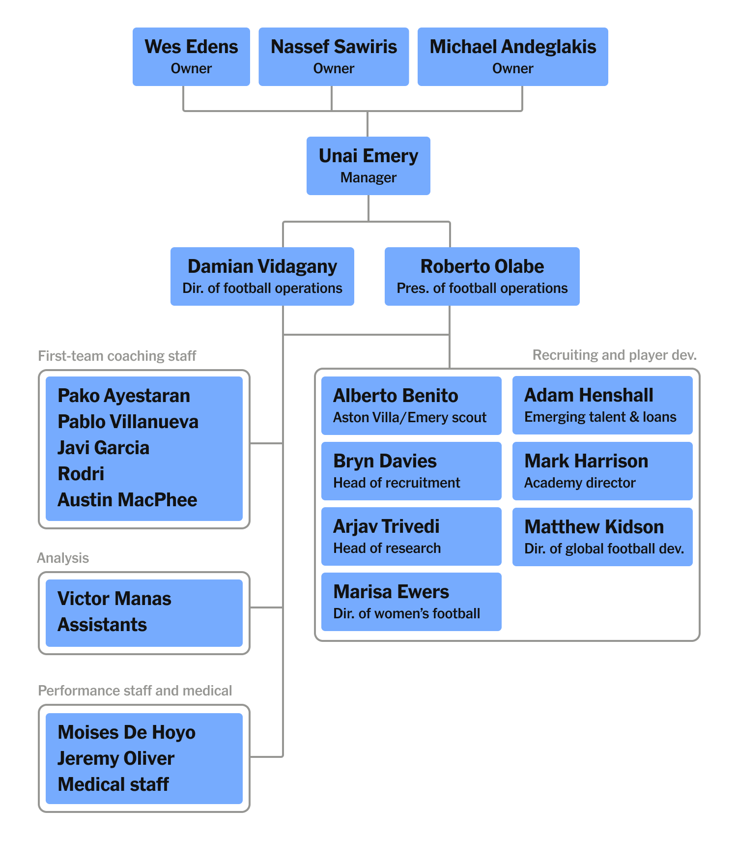 足球运营总监达米安-维达加尼是这套组织架构中不可或缺的关键人物。这位前记者在2008年至2012年间与埃梅里相识,当时埃梅里执教瓦伦西亚,维达加尼则在俱乐部的媒体和市场部门工作。