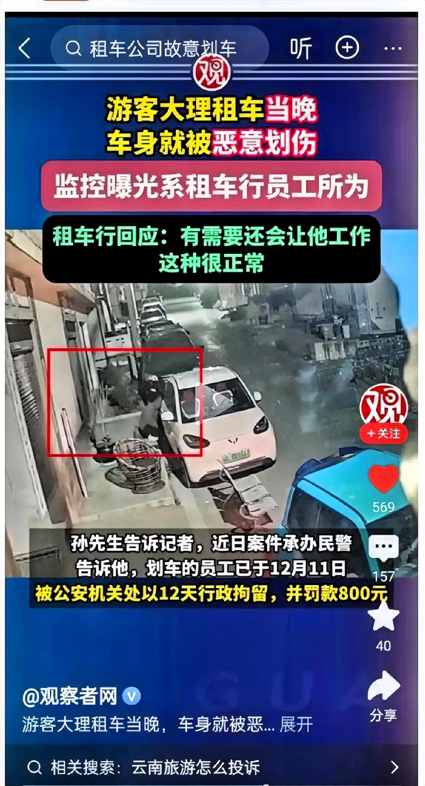 游客在大理租车游玩,当天晚上车身就被恶意划伤。报警后,调取监控,发现划车的竟然是租车行员工。 去大理租车游玩,本想开开心心赏风光,结果游客当晚就遇上糟心事:停好的车莫名被划伤。 报警调取监控后,真相让人愤怒——划车的居然是租车行员工!最终这名员工被警方拘留11天、罚款800元。 明眼人都能看明白,这明显是租车行想故意制造损伤,等着坑游客的赔偿款。这种黑心操作不仅坑惨了游客,更砸了大理旅游的招牌。 此事也给监管部门提了个醒,必须重拳整治租车行业乱象,对违法行为零容忍,发现一起查处一起,才能守住旅游市场的清朗风气。 大家出门旅游都遇到过哪些糟心的租车经历?快来评论区分享你的避雷经验!