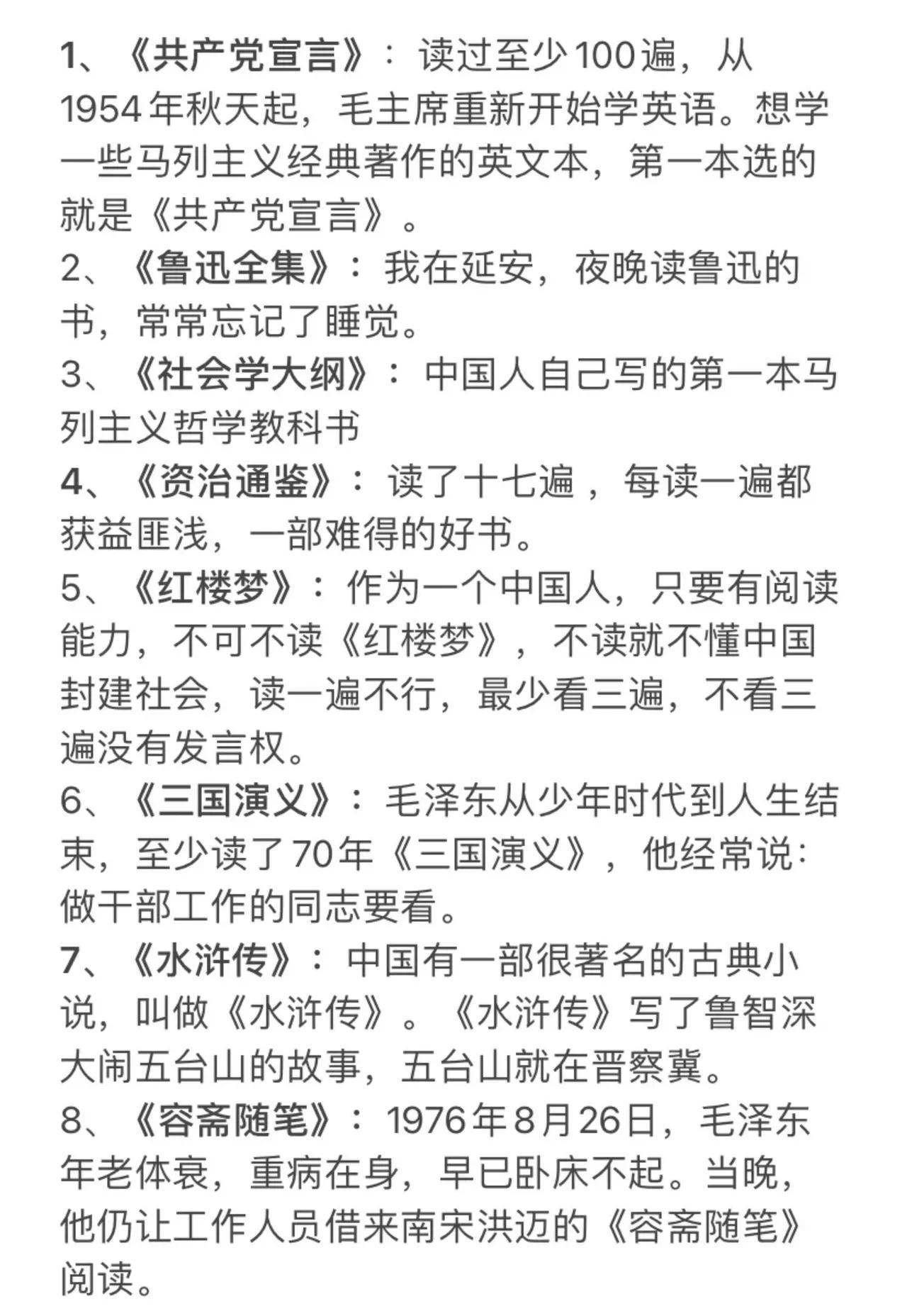 毛主席最喜欢看什么书? 下面就是他阅读遍数最多的书单。 他最喜欢读的就是马列的经典著作,这些经典著作奠定了毛主席的革命理论基础。 他第二喜欢读的就是我国的古典历史书籍。 就像《资治通鉴》这本书,直接被他翻到支离破碎。 毛主席为什么喜欢反复读书呢?因为他认为每阅读一次,都会有新的启发。 只有反复阅读经典,才能够构建自己的思想体系,站得高、看得远的前提就是反复阅读经典书籍。