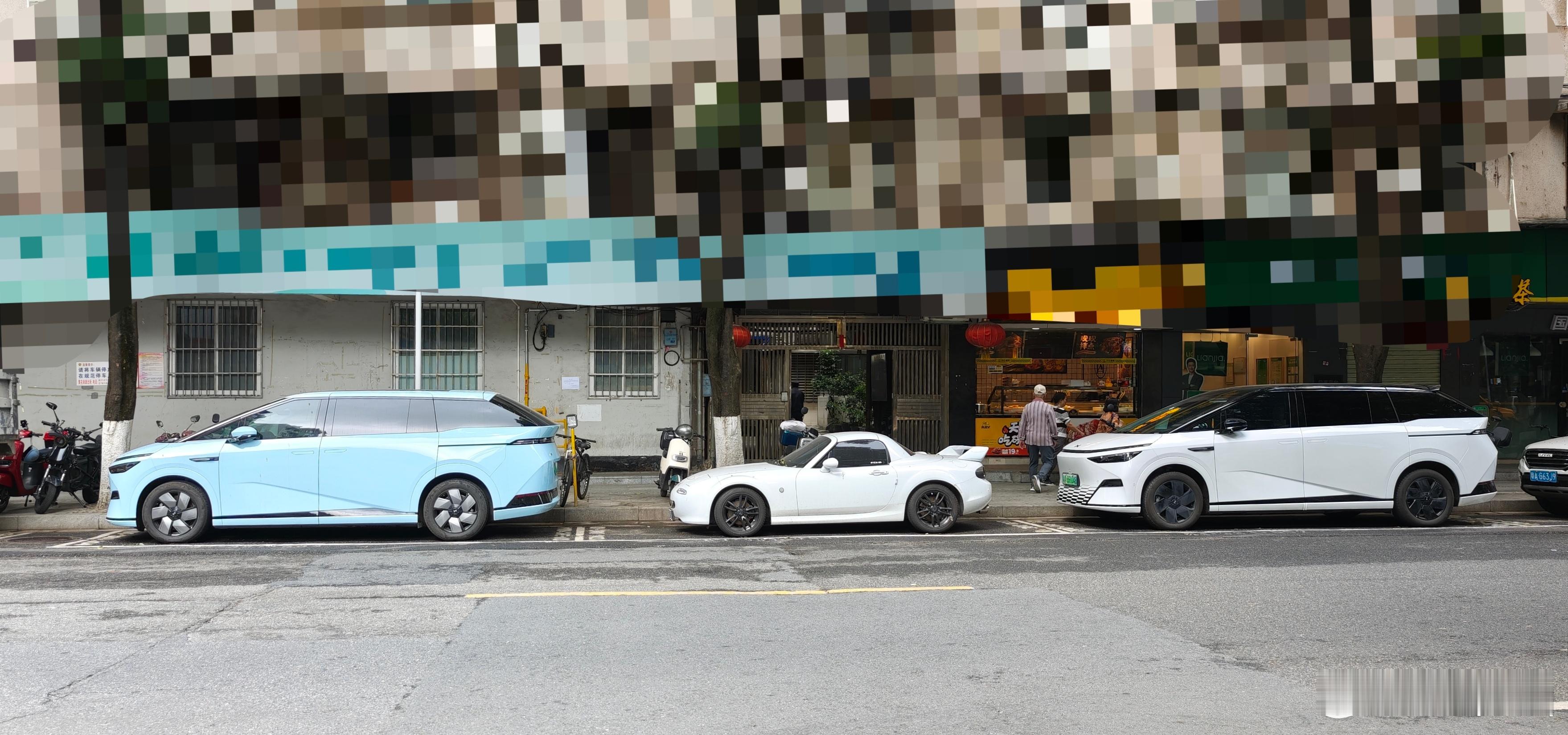 车小就是好啊!萤火虫停进侧方停车位,前后还能再停2台电鸡。对比一下图2的小鹏X9在老城区生活,开小车还是方便一点。