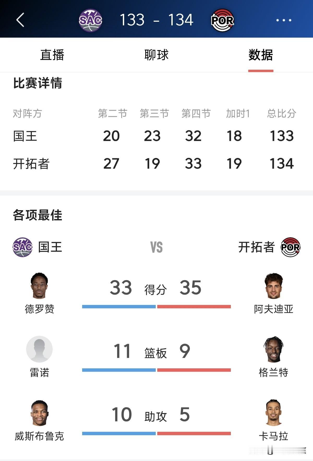 这场胜利真的是开拓者捡的,威少又要背锅了,我怎么不想开拓者赢,这是什么心理? 今天最后一场,开拓者主场加时134比133险胜国王,威少拿到20分10助攻3篮板,德罗赞拿到33分4篮板3助攻。 本场比赛杨瀚森还是没有出场,而同届二轮新秀雷诺拿到29分11篮板2助攻。国王估计观察一段时间如果可以可能要重点培养他了。