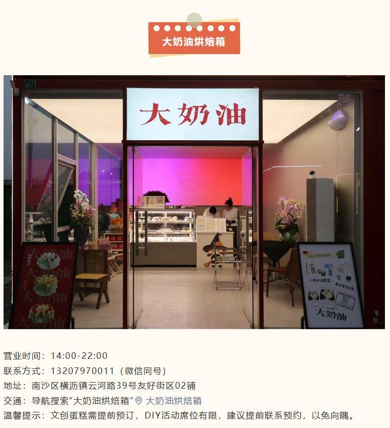【这里可以吃南沙地标蛋糕你知道吗?】灵山岛友好街区已经正式开业了,不知道你来逛过了没?虽然这边定义为类似集市,但是没想到里面的店也是卧虎藏龙。有家名为“大奶油烘焙箱”的蛋糕烘培店,不仅出品十分可以,甚至还有做南沙地标蛋糕。 “大奶油烘焙箱”的用料十分实在,坚持使用“铁塔”“蓝风车”动物奶油,乳酪是Kiri的,糖用韩国TS幼砂糖,低筋面粉选美玫。水果都是当季新鲜采购,比如赣南脐橙、火柿子、南沙本地奶油草莓,酱料也是自己熬,过季就下架,绝不使用预制品。此外,甜品上的颜色也来自食材本身,蓝莓的紫、树莓的红、开心果的绿,没有一滴人工色素。 而且蛋糕的外形设计也别出心裁,都是原创设计,Q萌可爱,一看就流口水,食欲大增。更加特别的是,店里还有南沙独特的文创蛋糕,白巧克力味灵山岛灯塔,到开心果树莓味的南沙IFC、抹茶味的南沙国际会展中心、蓝莓味的南沙字样款游轮等等。不仅可以美味一餐,还可以打卡拍照发圈。提供满满的情绪价值。 下次如果是来灵山岛儿童公园玩或者露营的话,可以过来这边帮衬一下哦! PS:文创蛋糕需提前预订,还有提供DIY活动。