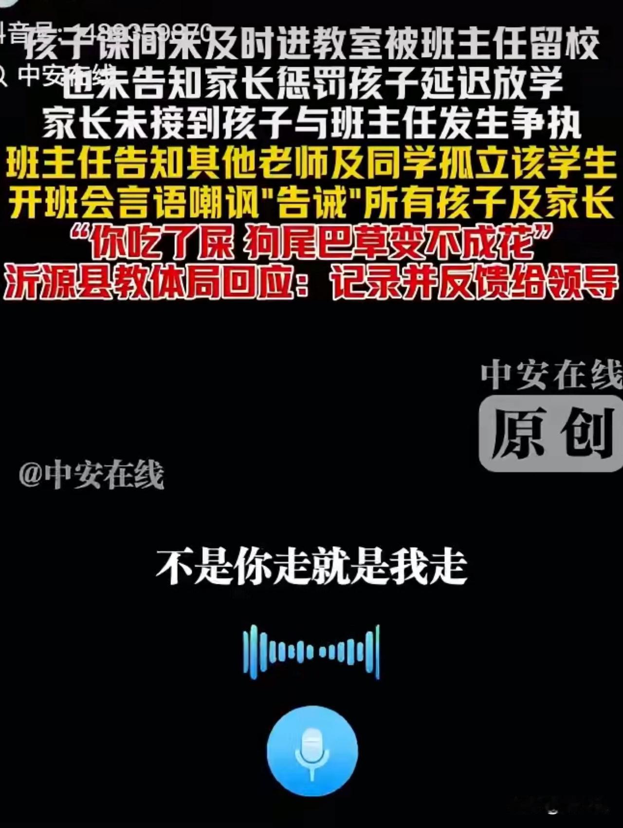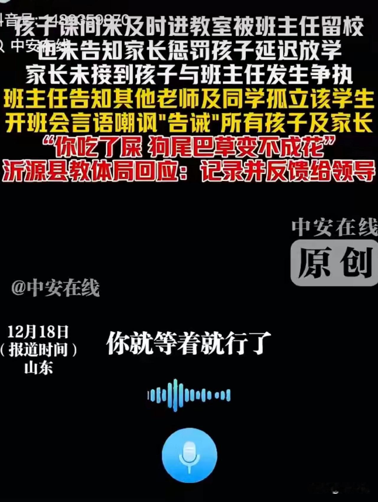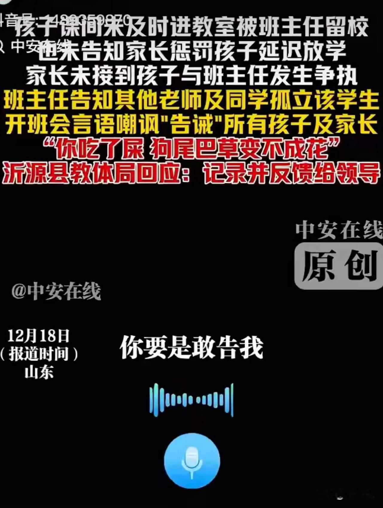 “这有些过分了吧!”山东一学生课间未及时进教室,被班主任留校惩罚却不通知家长。家长联系老师讨要说法,没想到竟点燃了老师的怒火。 这位班主任不仅在班会上嘲讽学生“狗尾巴草永远变不成花”,还放言“家长和我对立,吃苦的是孩子”,甚至教唆其他老师和同学孤立该学生,声称有百种方法让孩子难受。 视频曝光后,引发众多网友纷纷质疑:“这哪是为人师表?真不配站在三尺讲台,分明是仗着权力霸凌学生和家长,必须严肃处理!” 在周少看来,这位老师的言行完全背离了教育的初心。教育的本质是育人,而非用权力打压、用言语羞辱。 学生犯错,本该是家校携手引导纠正,可这位老师却把对家长的不满,转嫁到孩子身上,用孤立、嘲讽的手段摧残孩子的自尊心。 更可怕的是,他传递的“差生永远是差生”的偏见,会在孩子心里埋下自卑的种子。教育不是筛选“花朵”,而是让每一株“小草”都能茁壮成长。 希望教育部门能彻查到底,给家长和孩子一个公道,也给所有老师敲响警钟:师德,才是教育的第一生命线!#寻美三湘# #长沙新朋友#