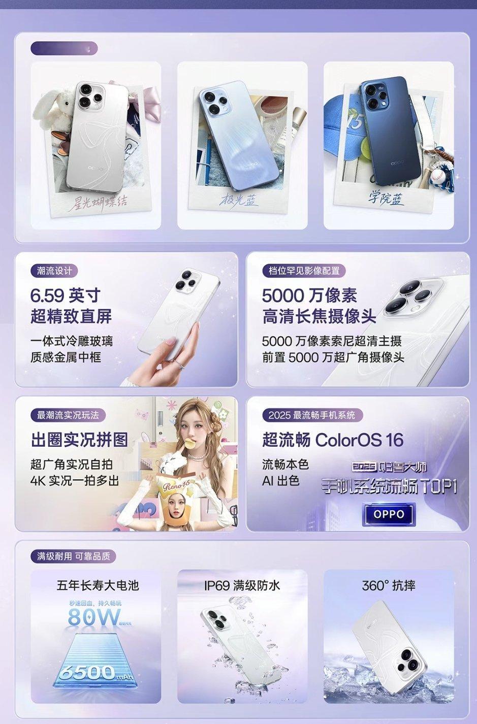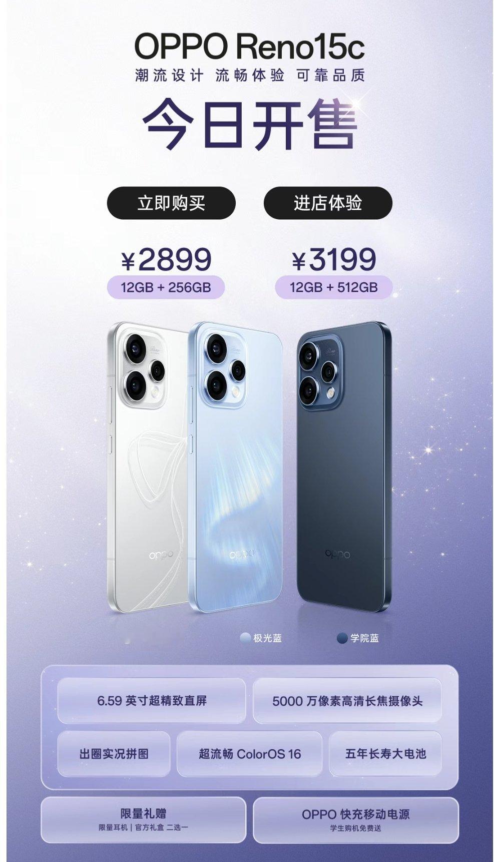 数码闲聊站 OPPO Reno15c开售,2899元起!1.处理器:高通骁龙7Gen4 !2.屏幕:6.59寸1.5K直屏,120Hz刷新率,3840Hz PWM调光!3.影像:前置5000w,后置5000w主摄+5000w潜望长焦+800w超广角!4.续航:6500mAh+80w!5.其他:ColorOS 16,IP69,360°抗摔,纳米冰晶散热,星光蝴蝶结、极光蓝、学院蓝三色,12+256GB 2899元起!