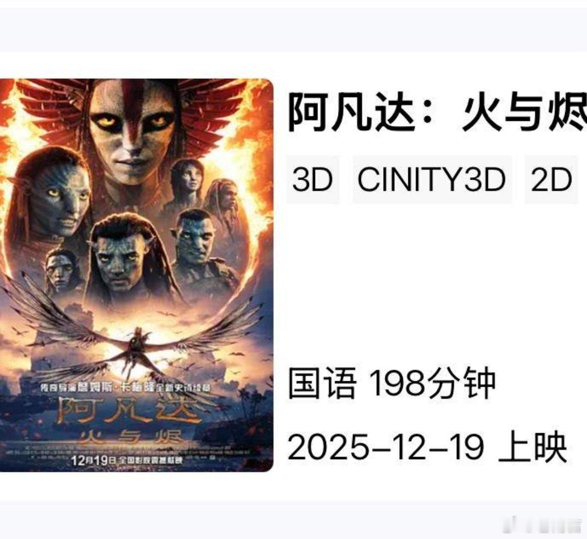 阿凡达3《阿凡达3:火与烬 》今天上映,片长198分钟。恰逢周末,晚上就去看。2009年首部《阿凡达》横空出世,16年后终于迎来它的第三部。看了一些点映评论,据说是2025年视觉巨作,令人非常期待!无论时空如何变幻,依然抵挡不住对电影的热爱。