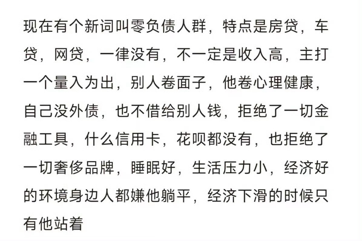 零负债人群 感觉零负债人群有种“看开了”的禅意呢,看了一下,除了零负债人群还有以下几种人群:1、有资产有存款;2、有资产有负债;3、无资产有存款;4、无资产无负债;5、无资产有负债。看看你是哪一类?