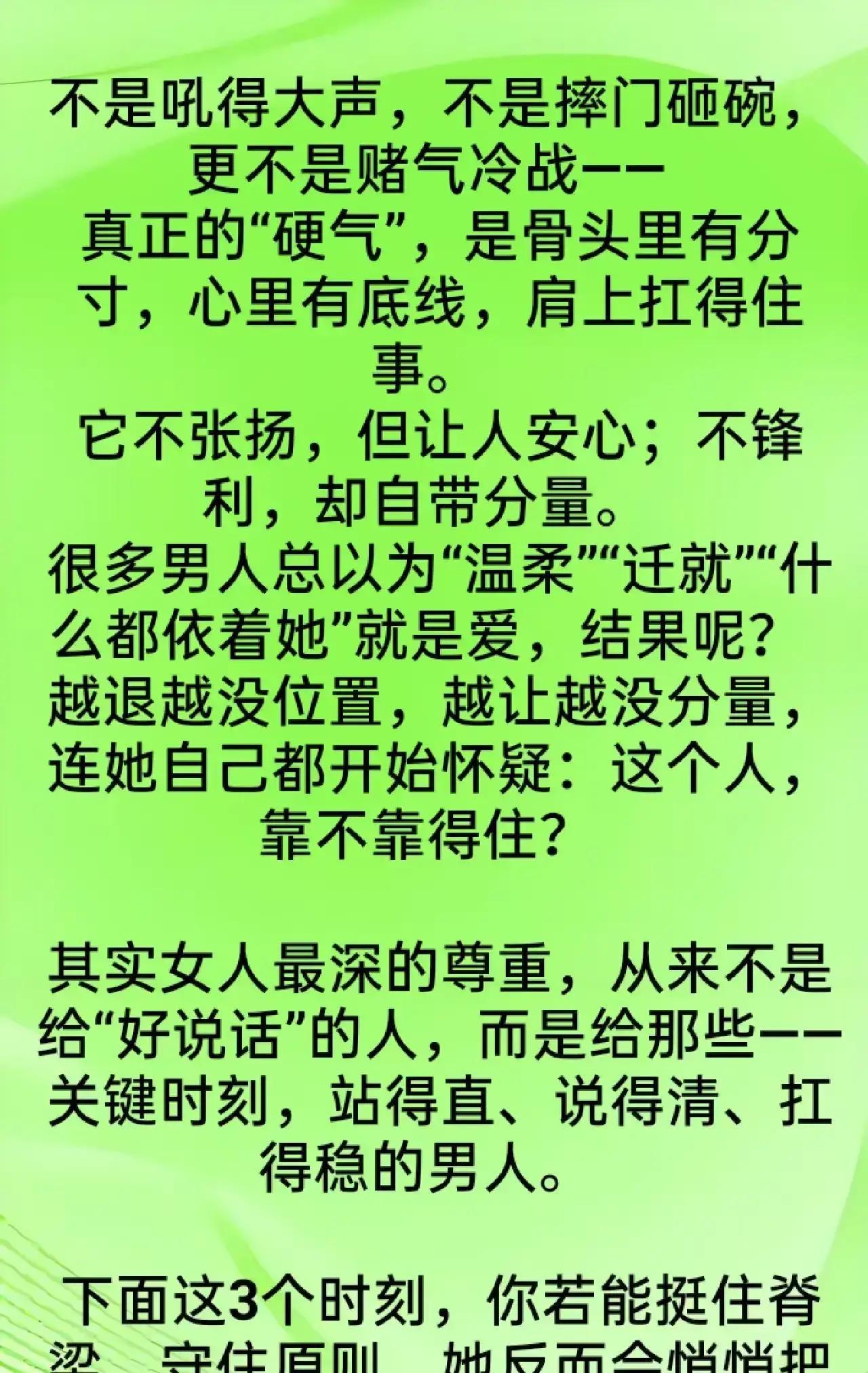 感情里最打动人的,往往不是甜言蜜语,而是男人那股子骨子里的硬气劲儿。遇到事儿时,他不靠踩低别人来显摆自己,也不选择闭嘴装没事逃避难题,就算自己再狼狈,也始终记得要做那个让她安心靠得住的人。 这种硬气,说白了不是生来就有的,而是通过一次次抉择练出来的。面对矛盾,他敢直球沟通;生活再难,他也咬牙扛着不退缩。心理学研究也表明,在亲密关系中,男人展现出的责任感和边界感,能大大提升伴侣的安全感和信任度,让女人觉得“这男人靠谱,能把后背交给他”。 真正的尊重,从来不是挂在嘴边的空话,而是深深扎在行动里。很多两性专家都强调,女人最记一辈子的,往往是男人那几次关键时刻挺直腰杆的样子——不卑不亢,守护着她,也守护着这段感情。 感情长久靠的不是完美,而是这种实打实的底气。它不张扬,却能让女人心甘情愿地跟着你走下去。男人多点这种内在力量,关系自然就稳了,也更吸引人。(298字