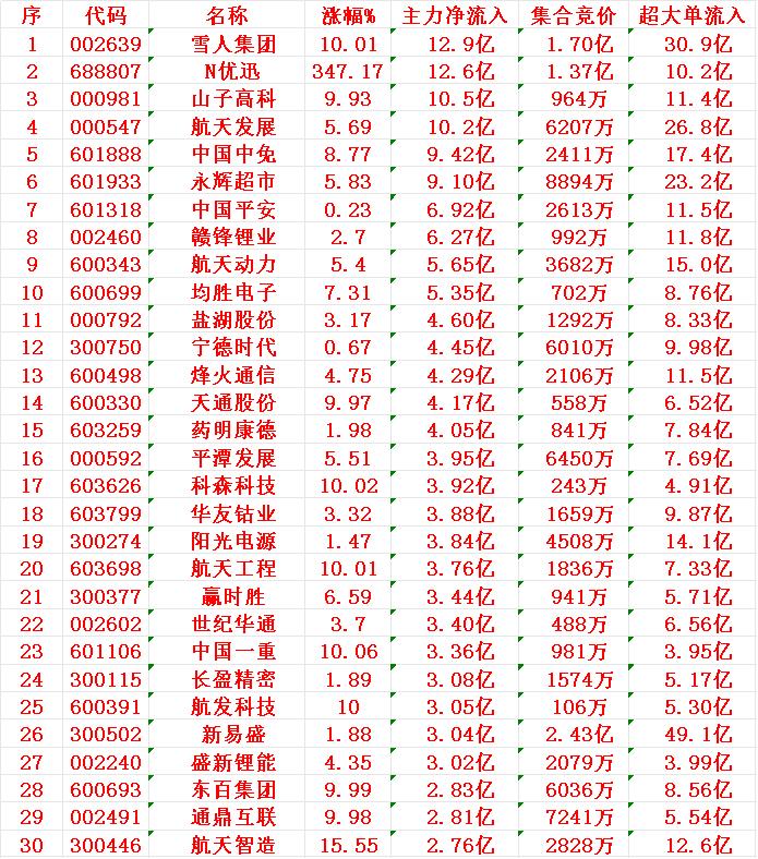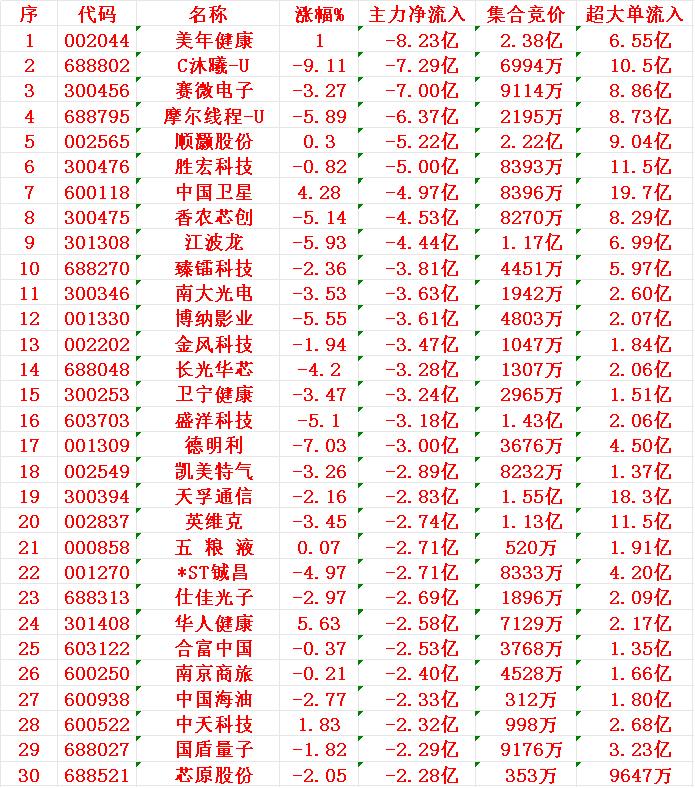 12月19日收盘,主力资金,已经大幅卖出的30名单: 美年健康:净流出8.23亿元 C沐曦-U:净流出7.29亿元 赛微电子:净流出7.00亿元 摩尔线程-U:净流出6.37亿元 顺灏股份:净流出5.22亿元 胜宏科技:净流出5.00亿元 中国卫星:净流出4.97亿元 香农芯创:净流出4.53亿元 江波龙:净流出4.44亿元 臻镭科技:净流出3.81亿元 南大光电:净流出3.63亿元 博纳影业:净流出3.61亿元 金风科技:净流出3.47亿元 长光华芯:净流出3.28亿元 卫宁健康:净流出3.24亿元 12月19日收盘,主力资金“大幅买入”的30名单: 雪人集团:净流入12.9亿元 N优迅:净流入12.6亿元 山子高科:净流入10.5亿元 航天发展:净流入10.2亿元 中国中免:净流入9.42亿元 永辉超市:净流入9.10亿元 中国平安:净流入6.92亿元 赣锋锂业:净流入6.27亿元 航天动力:净流入5.65亿元 均胜电子:净流入5.35亿元 盐湖股份:净流入4.60亿元 宁德时代:净流入4.45亿元 烽火通信:净流入4.29亿元 天通股份:净流入4.17亿元 药明康德:净流入4.05亿元