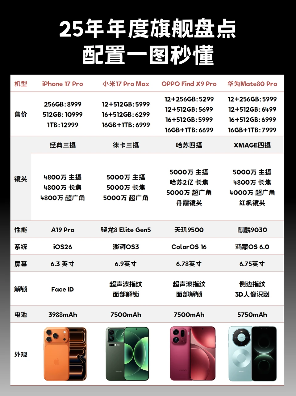国产这边[向右R]比如华为Mate80Pro,性能、续航提升明显,还升级了二代红枫镜头,拍照的色彩还原不输iPhone,鸿蒙6的流畅度也不错。小米17ProMax直接对标iPhone,背屏、7500mAh大电池、徕卡三摄等配置确实不赖。