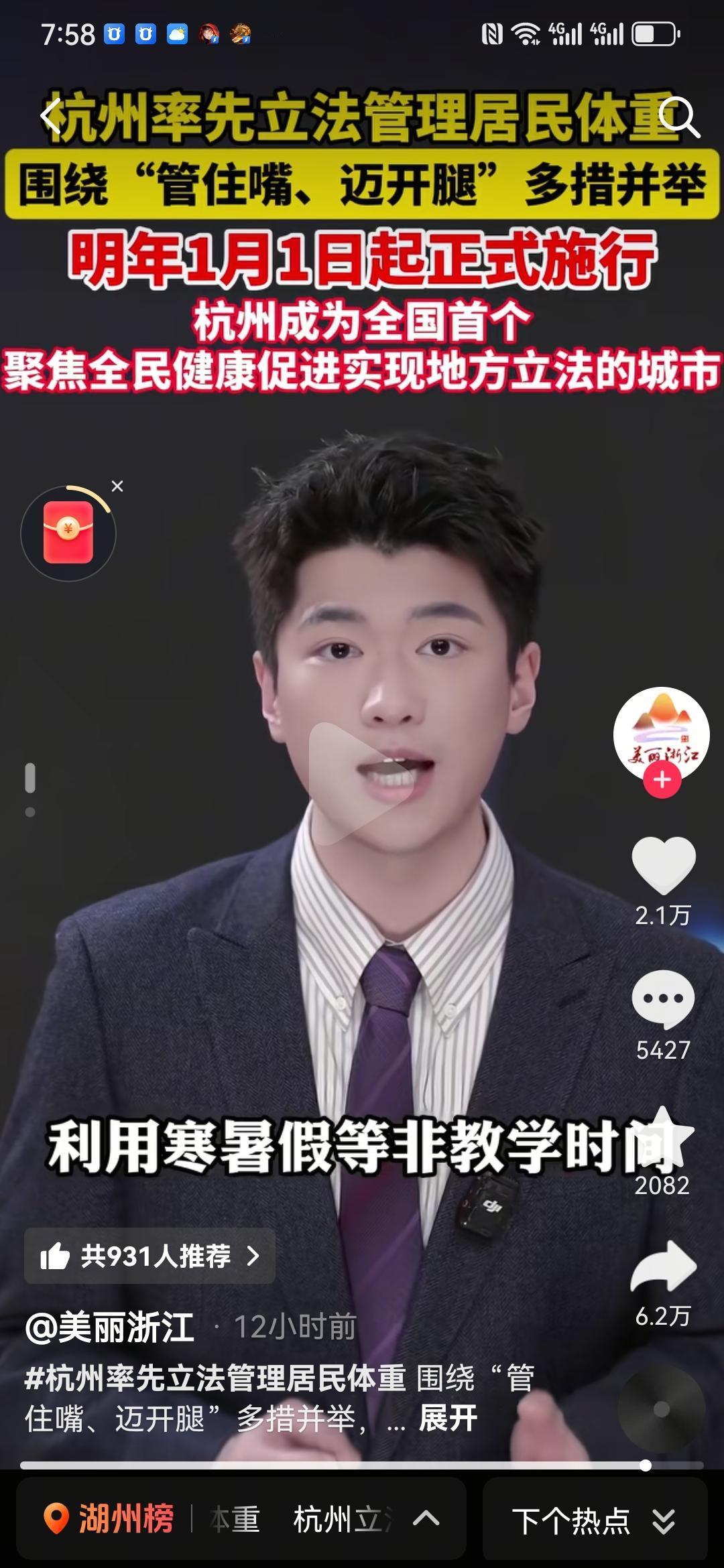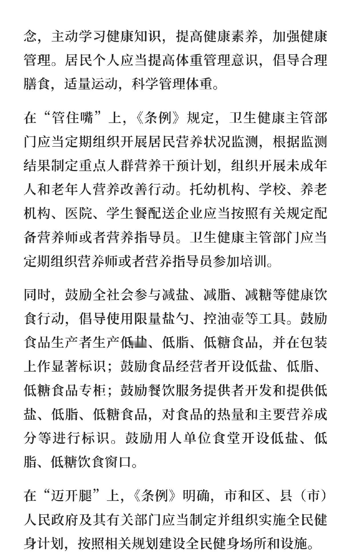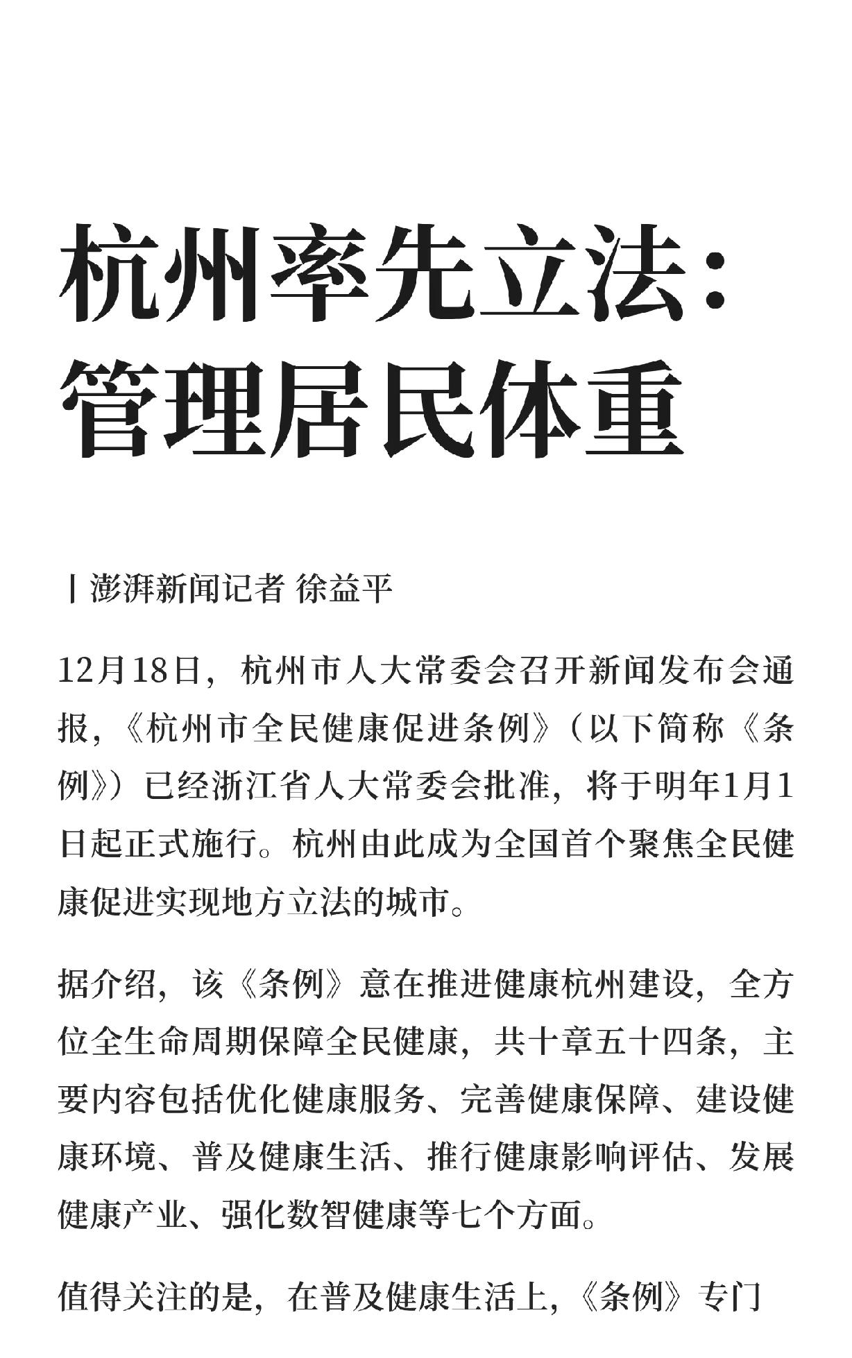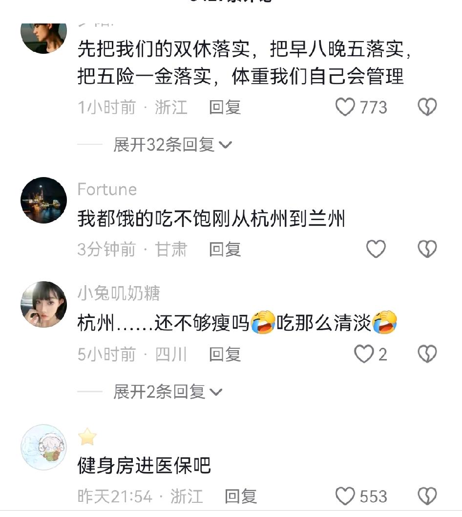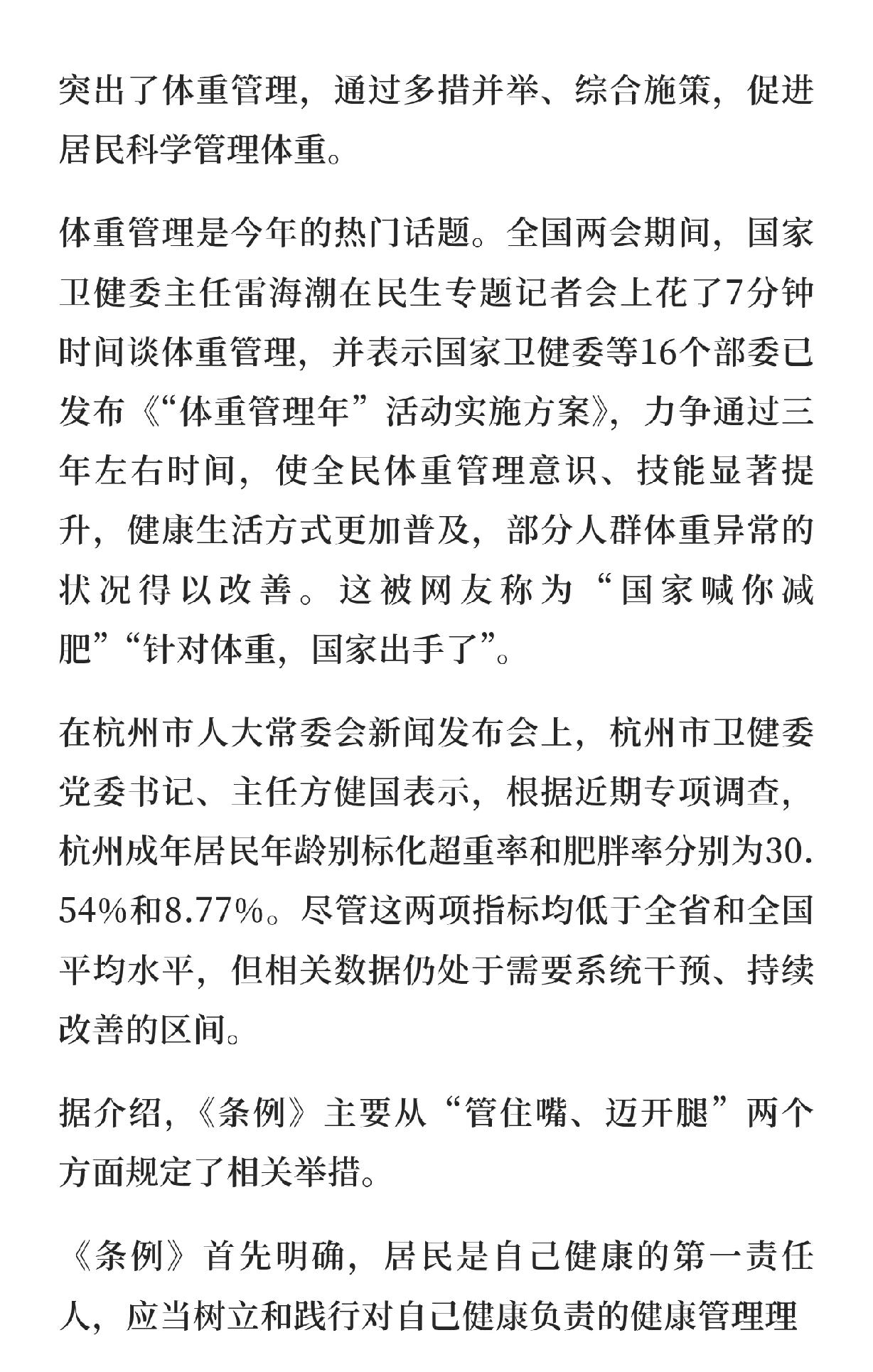 杭州居民有福了,从明年1月1日开始,杭州将立法管理居民体重。 看了下这个条例,主要是两个方面,简单总结下就是: 1、管住嘴,卫生健康主管部门帮助大家监测。 2、迈开腿,也就是多提供体育设施,多开展全民健身运动。 不过评论区不少网友认为,立法是好的,关键是能不能有效实行,比如双休什么都还没有完全落实。 更有网友建议健身房消费进医保。