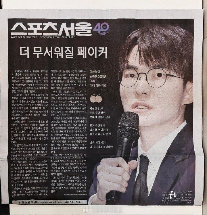 Faker登上首尔体育报头版:如有机会,我很想入选明年亚运国家队部分翻译如下:【以"活着的传奇"之姿持续前行。回望2025年,坚定面向未来的决心】李相赫在赛季结束后于洛杉矶举行的英雄联盟全球总决赛新闻发布会上坦言:“这次全球总决赛,我自始至终都没有完全自信过。对于能否获胜,并没有十足的把握。我们虽然一直在赢,但比赛过程并不轻松。我觉得是坚持到底的意志支撑着我们。”2026年还将举办亚运会,李相赫也表达了对亚运会的渴望:“能够参加亚运会的选手非常幸运。如果有机会,我非常想参加。”自2013年出道以来,他一直居于顶峰。虽也曾经历危机,但他始终是那个独一无二的李相赫。随着新的挑战开始,众人对他“2026年崭新篇章”的旅程充满期待。FakerLCK英雄联盟S15