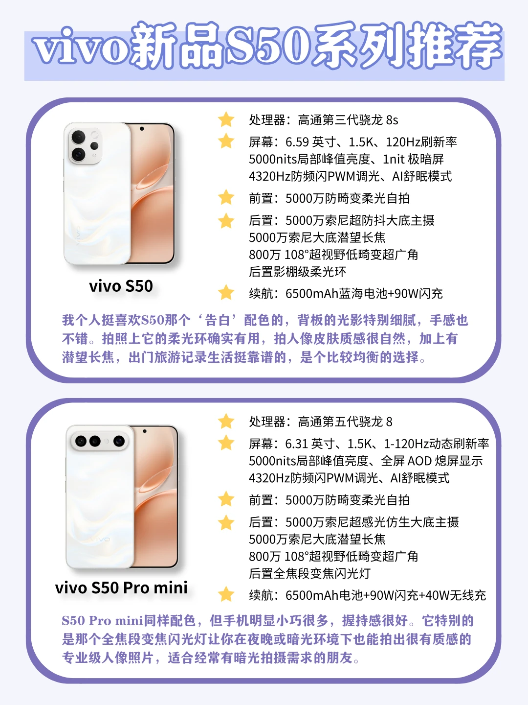 · 喜欢小屏,并希望性能与功能更全面:vivo S50 Pro mini 更为合适。它补足了无线充电,并带来了更强的处理器,是小屏爱好者的升级之选。