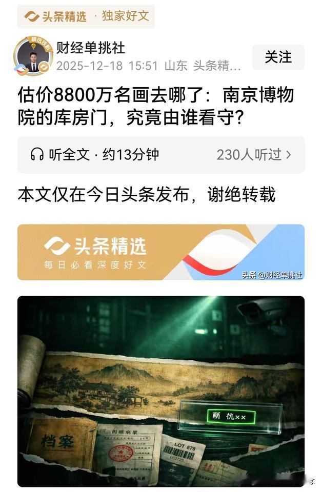 我估计南京博物院这事会不了了之, “京城第一收藏家”马未都发视频, 他说:“文物鉴定没有上帝之眼”。 就是说没有一个人可以在无限的空间和时间内看到这件东西。简单的说,仇英这张画是不是仇英画的,谁也没看见。所以拍卖行在鉴定真伪这件事儿上是免责的。 也就是说,谁也没亲眼看到仇英画这幅画,也没人能监控到这幅画的流转,大家认为的“真”,也是因为攒够了足够多的标签,比如某某名家旧藏、被哪本权威书记载过、笔法风格和公认的真迹对得上。 而南京博物院就用两次专家鉴定,撕碎了原来的标签,给它贴上了“假”、“伪”的标签。有些话马未都也无法明说,这幅画可能会卡在“真假存疑”这个状态里。 关键是,那幅被定义为“假”、“伪”的画,在2001年被卖给了一个“顾客”,价格为6800元。马未都说,文物商店卖东西开发票必须要写真实的姓名,除非这个人就叫顾客,而且就算是假的画,也不止这个价钱。这其中的猫腻可想而知。 所以,这事儿就有点意味深长了,在“没有上帝之眼”的领域里,我们至少可以追问,谁在扮演“上帝之手”?又是谁,在为“共识”悄悄标价?希望能有一个令所有人信服的官方定论。 南京博物院