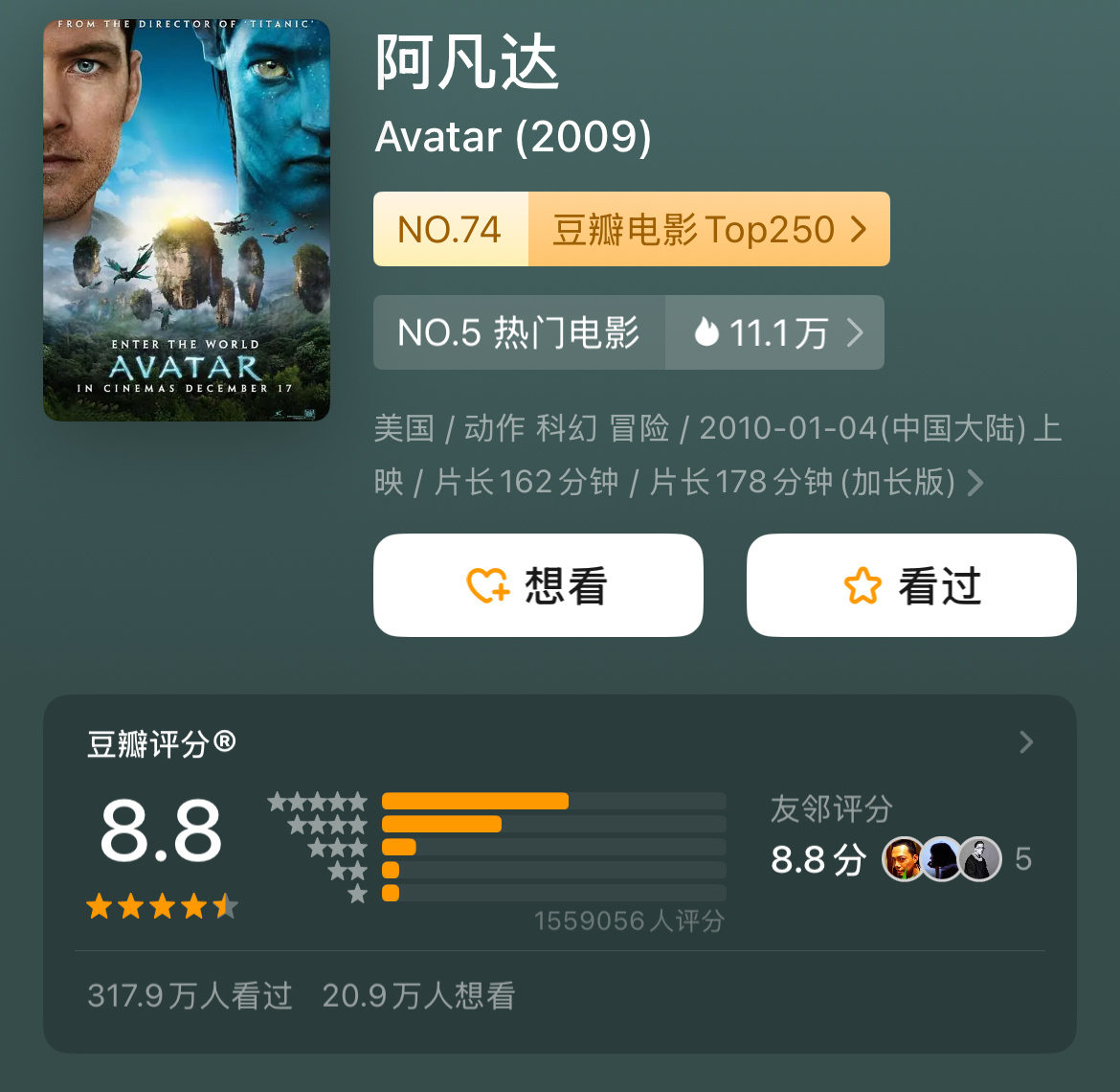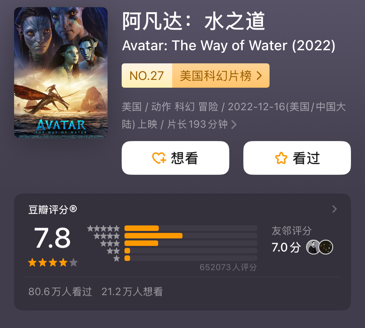 《阿凡达3》豆瓣开分7.6前两部评分:《阿凡达1》8.8、《阿凡达2》7.8阿凡