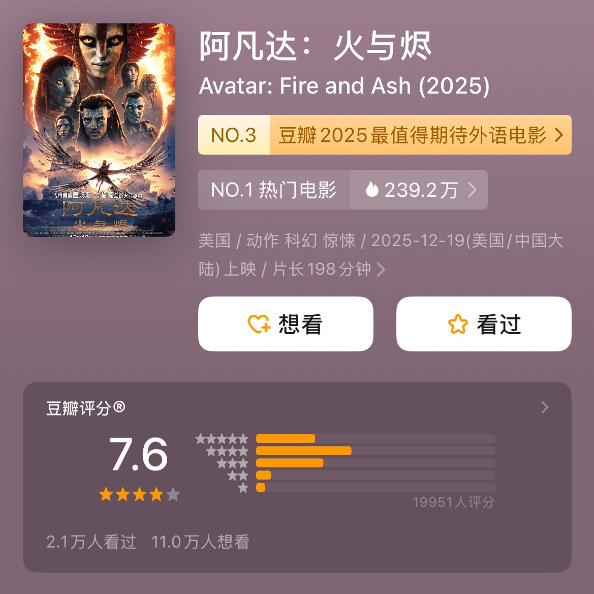 《阿凡达3》豆瓣开分7.6前两部评分:《阿凡达1》8.8、《阿凡达2》7.8阿凡达3开分7.6阿凡达3豆瓣开分7.6