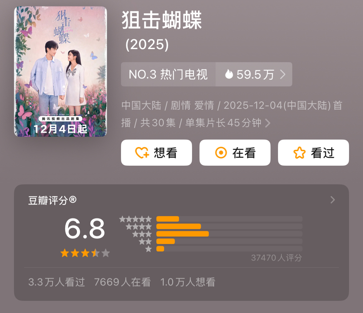 《狙击蝴蝶》豆瓣开分6.8狙击蝴蝶豆瓣开分6.8
