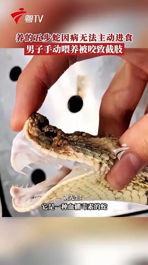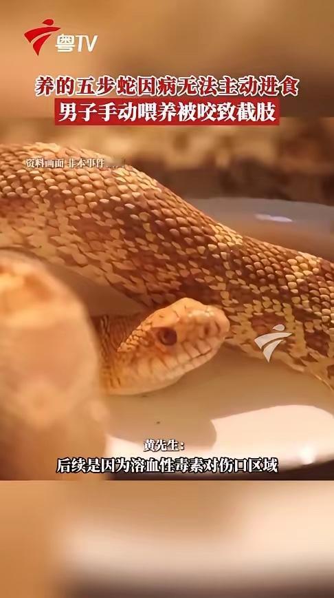 “悲剧还是发生了!”近日,北京,一男子把“五步蛇”当宠物养,结果毒蛇因生病,无法主动进食,男子只能自己拿着食物往蛇嘴里塞,结果不慎被毒蛇咬伤,因毒素对伤口破坏严重,最终只能截肢保命!网友:胆子不是一般的大! 黄先生从小对蛇类感兴趣,觉得养一条毒蛇当宠物很特别。他怎么也想不到,这个让他觉得与众不同的爱好,会让他付出截肢的代价。那条五步蛇生病后,他心疼宠物,决定亲手喂食。就是这一时的不慎,改变了一切。 五步蛇,学名尖吻蝮,它的毒素是血循毒素,对血液凝固系统破坏力极强。被咬后,黄先生的大拇指区域因溶血性毒素严重破坏,最终组织坏死,只能截肢。这不是简单的伤口感染,是毒素对身体组织的彻底摧毁。 像黄先生这样因为饲养“异宠”而遭遇不幸的案例并非个案,有23岁的姑娘因饲养银环蛇被咬,紧急抢救一周才脱离生命危险。这些看似新奇的宠物,背后隐藏着巨大的安全风险。 近年来,饲养“异宠”的人越来越多。许多人为了追求独特和个性,选择了蛇、蜘蛛、蜥蜴等非传统宠物,却低估了其危险性。 这些“异宠”大多来源于野生动物,不仅本身可能具有毒性或攻击性,还可能携带细菌、真菌、病毒、寄生虫等各种病原体。比如蜥蜴的粪便可能传播沙门氏菌,而土拨鼠可能携带鼠疫杆菌或狂犬病毒。 像孕妇、5岁以下儿童、老年人以及免疫力低下的人群,要尽量避免饲养啮齿类、爬行类等“异宠”。这不是偏见,而是基于安全考虑的必要前提。 当追求个性与新奇的冲动,超过了对自然规律的敬畏时,悲剧的种子可能已经埋下。一条蛇、一只蛙,它们首先是具有生物本能的动物,然后才是人们眼中的“宠物”。尊重生命,首先就要尊重它们与生俱来的危险性。 各位读者你们怎么看?欢迎在评论区讨论。