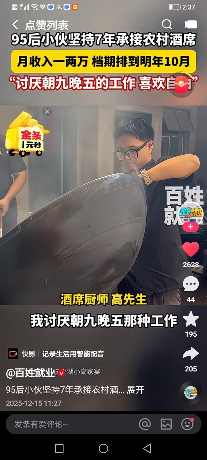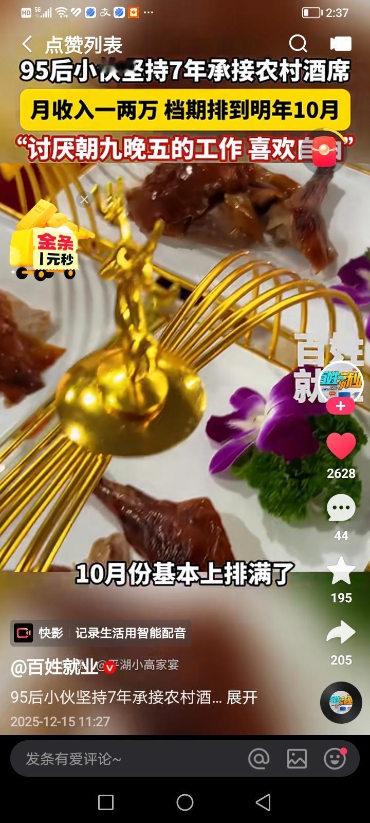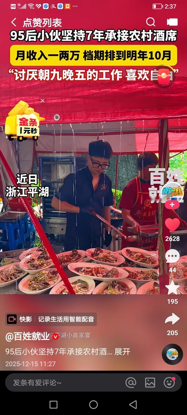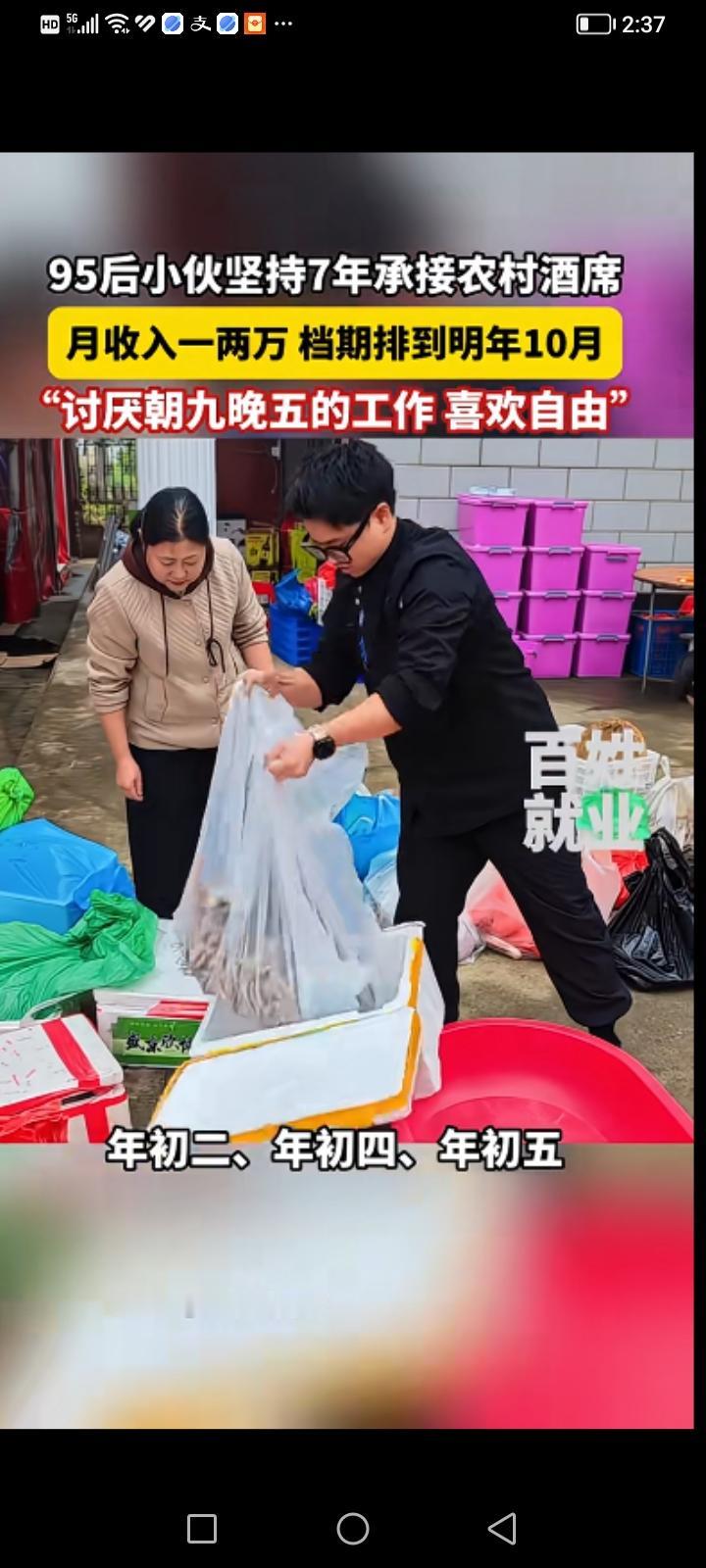 今天的农村其实很不错的,尤其是在南方,现在南方这边经济不差,农村人其实也不差钱。许多人认为农村人没有消费力,这点其实我是不认可的。今天介绍一种农村的职业:上门酒席。听名字就知道是给别人上门办酒席的,现在南方这边人有钱图省事,就不愿自己再办酒席了,都是找专业的厨师团队办上门酒席。这行业分两种:半包和全包。半包就是东家自己买菜找帮厨,你的工作就是布置桌椅,烧菜,一般是夫妻的多,有些可能是夫妻加上自己孩子一般三个人就够。很多人可能以为他们一年赚不了多少钱。这么想就错了,事实上他们非常赚钱,尤其是手艺好的,一年根本停不下来,你要找他们都得提前打好招呼。三年前我外婆过80岁生日,找的就是上门酒席,菜是我舅舅他们买的,上菜也是几个阿姨端的。我们那边做大寿,一般是两餐,前一天在晚上加第二天中午的正餐,第一天晚上是12桌,第二天中午是18桌,付他们夫妻工资是一桌100,30桌就是3000块,然后加上600的红包,共给了3600。 去年村里一户人结婚,我看了下那天晚上是32桌,那他前一天晚上20桌肯定是有的,他这一户办下来6000块钱是有的。江西上饶老家半包的那种比较多,主要受经济影响,我们那边菜基本是以鸡鸭牛肉猪肉鱼牛蛙和一些当地特色菜。这些菜一般在当地菜市场都可以买得到,所以成本不是很高。对厨师的技能要求也不会太高,只要你做的不是太难吃,在当地都会有市场。以前村里只有一户人家弄,去年有一个村民,他原来在北京开饭店的,去年也回来做了这行,毕竟在北京他一年也只赚20万,回来做上门酒席也差不多有这个数。很多人会说一个村有两户,那大家还能赚到钱吗?他们服务对象主要是面向全乡的,不是全村。只要你的手艺够好,就能名声传到更远的地方。别说一个村里有两户同行,再多的也能赚钱。全包这种就属于从买菜布置桌椅,帮厨全部团队自己出,东家就啥也不操心了。他们这种专业团队人员多,开支也大,这种在浙江和福建情况比较多了。浙江和福建他们酒席菜品好,都是各种海鲜高档菜,这种价格就高,他们团队就需要有专业进货渠道。那么这种就利润也非常高,像浙江这边做一餐全包酒席,弄下来的话,能赚不少。无论是半包还是全包,只要你手艺好,名声传出去了,那旁边村就会有人来找你办酒席,名声就传的更远,一般只要你的名声在乡镇打出来了,那你基本就属于全年无休的工作状态了,他们都得排队。今天自媒体它的传播速度非常广,我刷到我们上饶一个厨师团队,他就每天在不同的地方做上门酒席,经常跨县。许多人涌入大城市,不愿回到小山村。事实上,如果你真的对你们当地了解的话,其实农村是大有可为的,只是大部分人的思维很固化,认为农村没有出路,还是在于你自己能不能抓得住农村人的需求?有没有相匹配的这方面技能?(图片信息来源:百姓就业)农村 农村美食 农村人收入 未来农村经济 农村人新出路 农村实情 农村生活环境