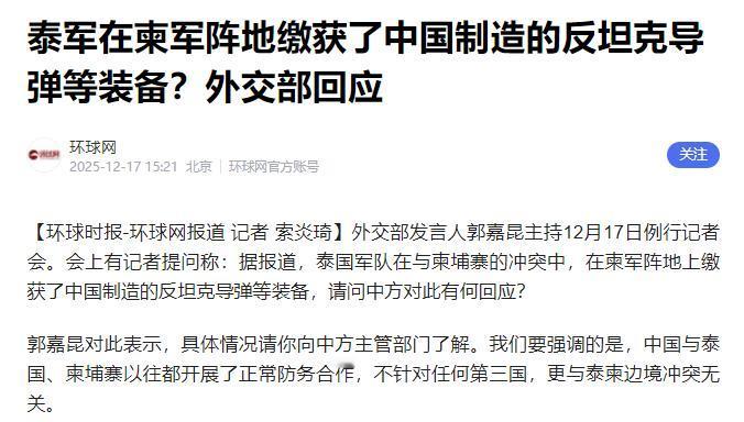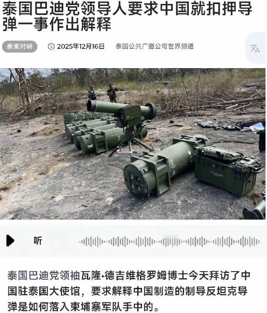 泰国右翼在野党巴迪党的操作属实让人看不懂,当地时间16日,党首瓦隆直接跑到中国驻泰使馆门口要说法,理由是泰军缴获了柬埔寨人手里的中制反坦克导弹。 柬埔寨是主权国家,只要符合国际法和国际惯例,从中国买武器用于国防,这是人家的正当权利。 中国国防部12月18号已经明确回应了,说中柬的军贸合作不针对任何第三方,完全符合规矩,跟柬泰边境冲突压根没关系。 放眼全球,武器外流确实是个常见问题,但处理方式从来没这么离谱的。 就说美国和墨西哥吧,每年有超过50万支枪从美国非法流入墨西哥,2020年墨西哥缴获的枪支里,70%都来自美国,这些非法枪支直接让墨西哥的涉枪暴力事件居高不下。 墨西哥政府之前也把美国军火商告上法庭,结果诉讼被驳回了,但人家也没像巴迪党这样跑去美国使馆闹啊?反而选择跟美国协商,搞联合打击非法枪支贩运的计划。 再说了,咱们对武器出口的管控严得不能再严了。中国早就加入了《武器贸易条约》,还定了军品出口三原则,简单说就是只帮着人家正当自卫,不破坏地区和平,不干涉别国内政。 而且2024年12月刚施行的《两用物项出口管制条例》,把出口管制的规矩定得更细了。 所有军品出口都要走审批流程,对方得提供最终用户和用途证明,承诺不转手给第三方,重大项目还得报国务院和中央军委批准,海关没许可证根本不放行。 咱们连化学武器这种大规模杀伤性武器都管得明明白白,是首个通过禁化武组织500次民用工业视察的国家,怎么可能让反坦克导弹随便流出去? 最让人想不通的是,巴迪党作为泰国的政党,不想着怎么帮国家发展,反而在这种敏感问题上挑事,破坏中泰的友好大局。 今年是中泰建交50周年,这50年来两国合作有多深?泰中铁路二期都获批了,以后中国游客说不定能坐高铁直接去泰国玩。 农业、数字经济、新能源汽车这些领域,两国都在深度合作,中国连续多年都是泰国第一大贸易伙伴。 这些合作实实在在惠及了两国老百姓,巴迪党这么一闹,伤的是两国之间的信任,最后损害的还是泰国自己的利益。 其实真要是担心武器外流,正确的做法很简单:先把事实查清楚。这些导弹到底是不是合法出口的?是哪个环节出了问题? 如果是柬埔寨管控不力,就找柬埔寨沟通;如果是非法走私,泰国、柬埔寨和中国完全可以联手打击。 中国从来都不回避责任,真要是查出有中方企业违规,肯定依法严惩。但现在事实都没影子呢,就跑来兴师问罪,这不是解决问题,是制造矛盾。 现在国际上本来就不太平,大家更该齐心协力维护和平,而不是随便找替罪羊。 中国一直都是世界和平的建设者,对武器出口严格管控,就是怕武器变成破坏和平的工具。巴迪党的这种做法,既不符合中泰友好的大局,也违背了国际公义。 也希望泰国各界能明辨是非,珍惜中泰这50年的友谊,别让个别政党的政治操弄,影响了两国人民的感情。 搞对抗没出路,合作共赢才是正道,巴迪党再这么闹下去,最后只能是搬起石头砸自己的脚。
