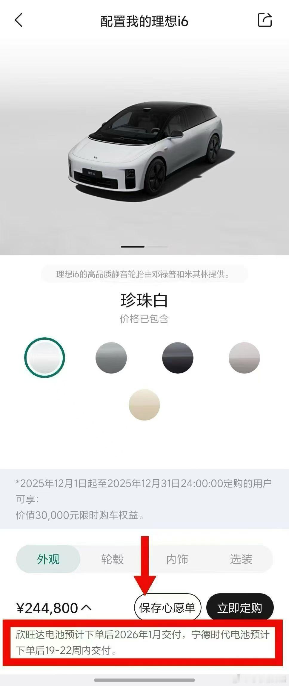 现在下单理想i6愿意选择欣旺达电池的就可以在1月份提车了!而选择等宁德时代电池的