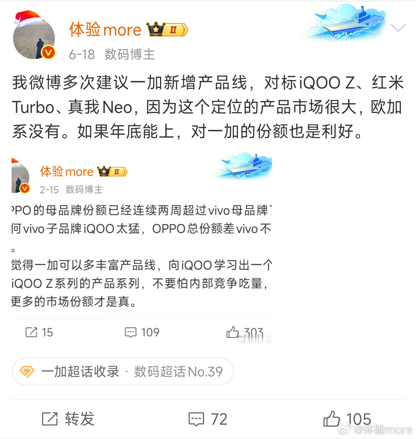 一加 Turbo 系列主打大电池和165Hz普及,定位比一加 Ace 6T低一点。虽然和我的建议没关系哈哈,但有了一加Turbo系列,我很看好一加明年份额继续同比增长。竞品就是图2说的iQOO Z啊,红米Turbo啊。