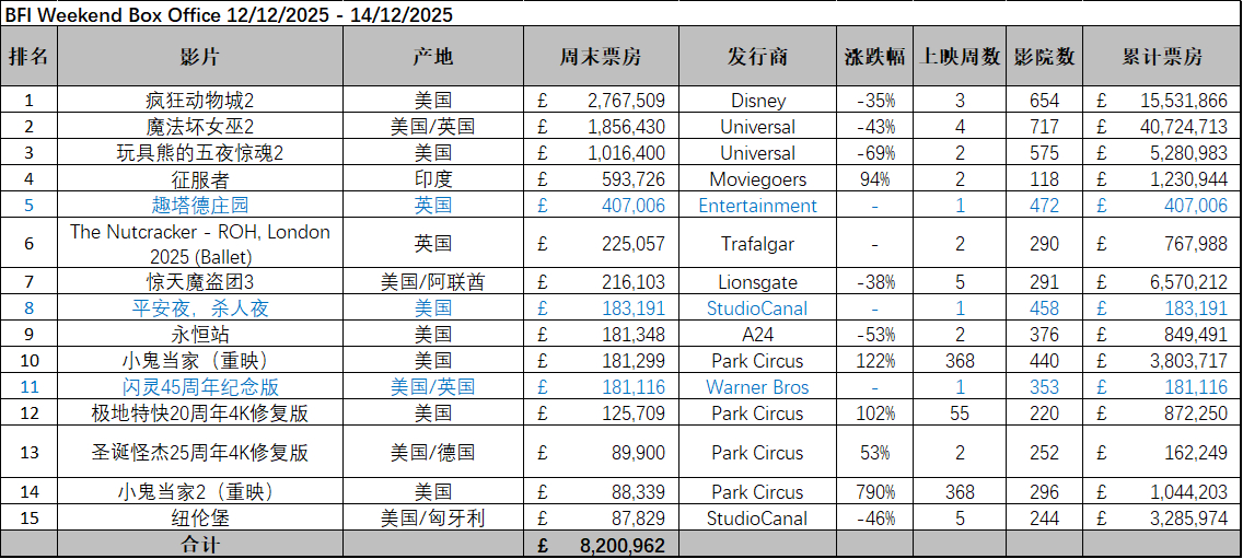 英国周末票房(12.12-12.14):1.《疯狂动物城2》三连冠,累计票房1553万;2.《魔法坏女巫2》累计票房突破4000万;3.《趣塔德庄园》在新片中成绩最佳。(数据:BFI)