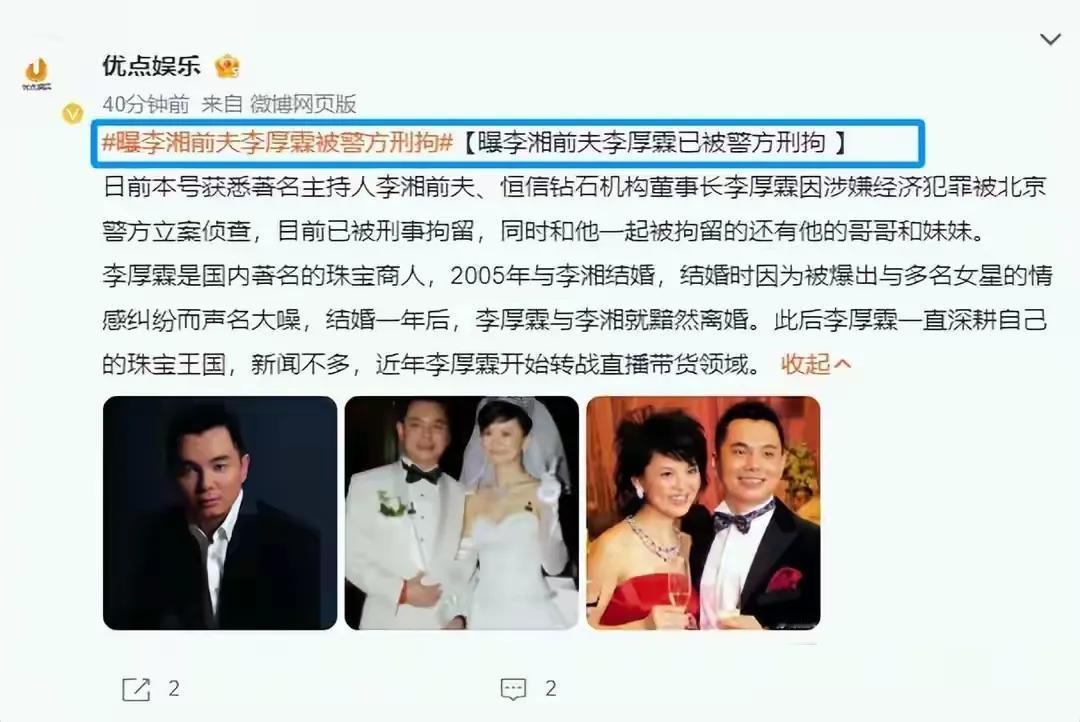 李湘前夫李厚霖被抓,去年还直播带货还债,没想到背后涉及经济犯罪。 国内著名的珠宝商人李厚霖,因为经济犯罪被刑拘。一起被拘留的还有他的哥哥妹妹。 李厚霖,天津人,1973年出生,现年52岁。 回首李厚霖的来时路是很辉煌的。成功人士,珠宝行业的佼佼者。又热心公益。也得到过很多肯定。 李厚霖去年还在直播带货,还债。看来直播带货也填不了欠下的大窟窿。