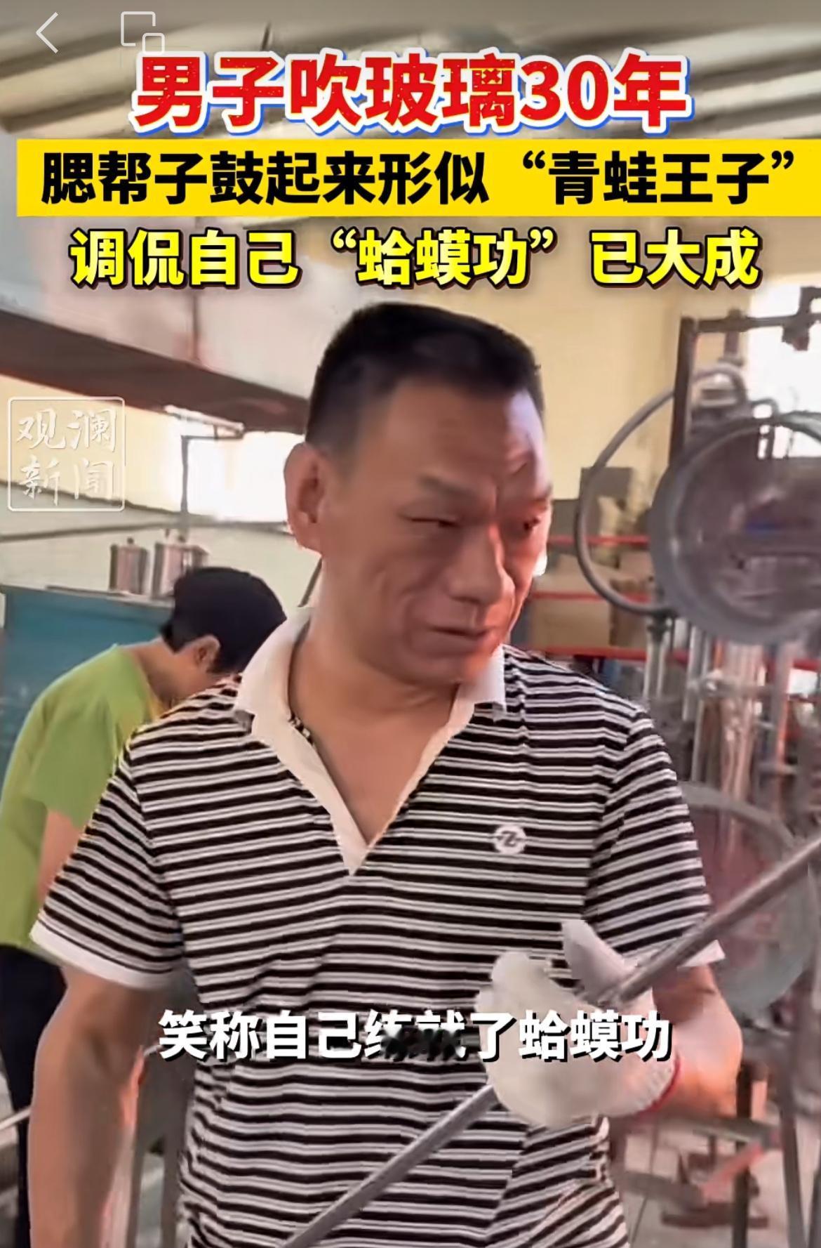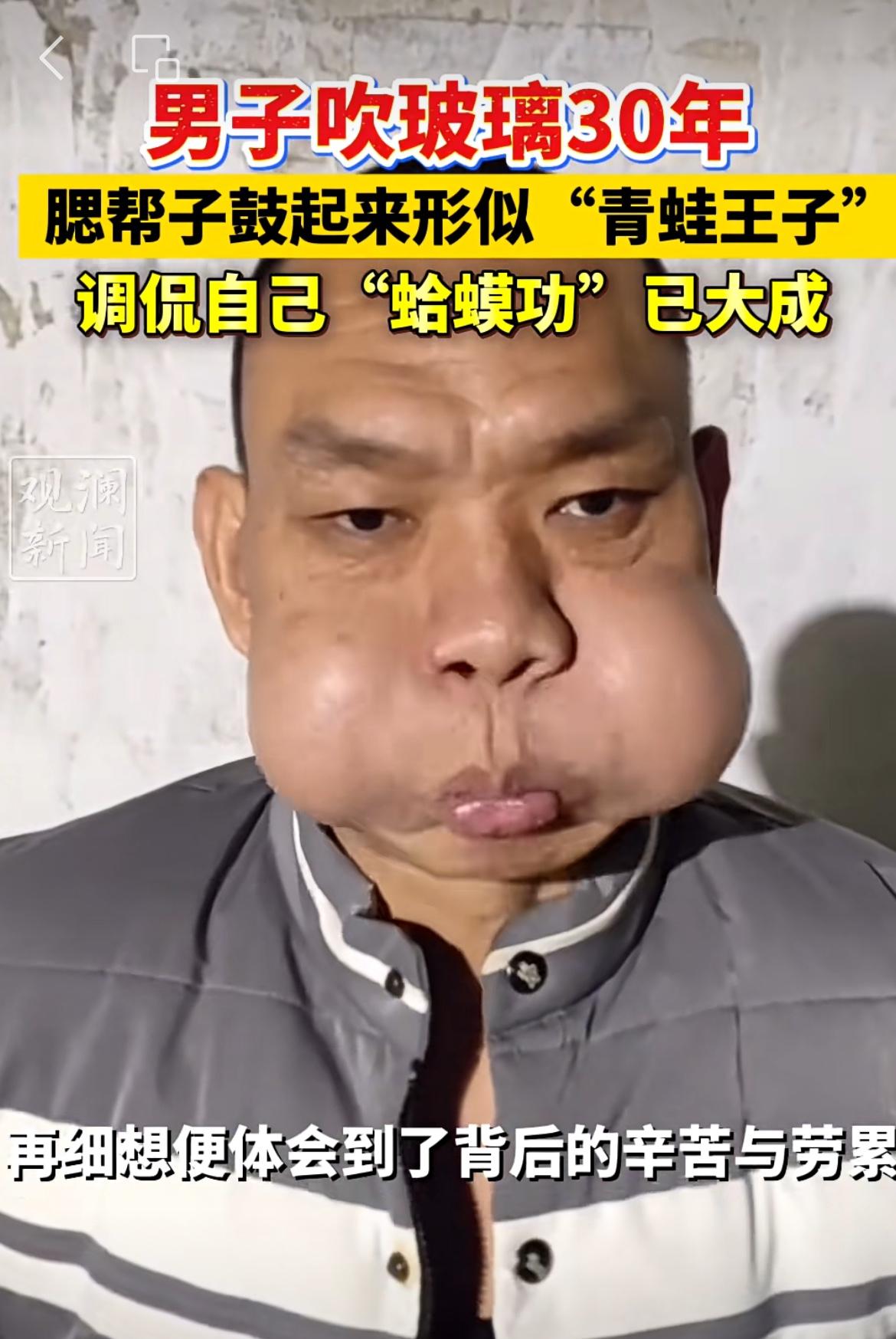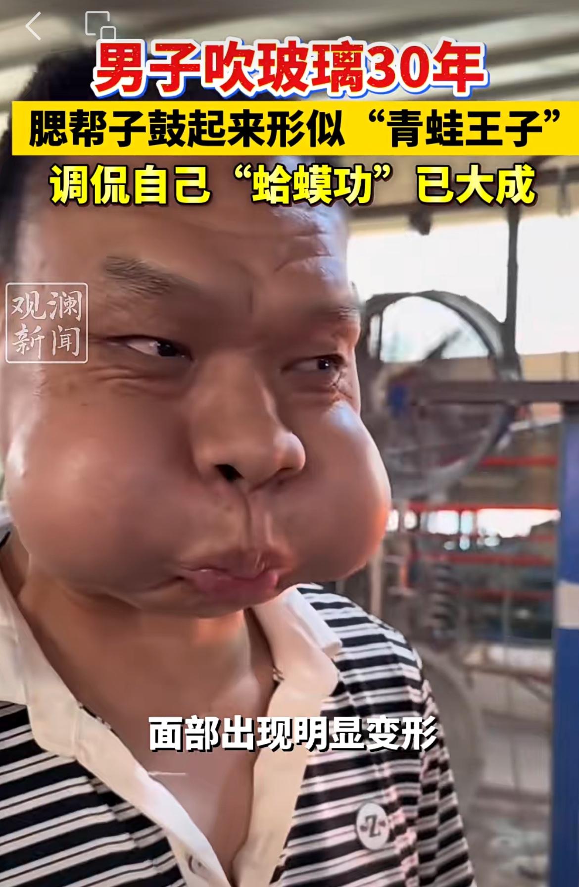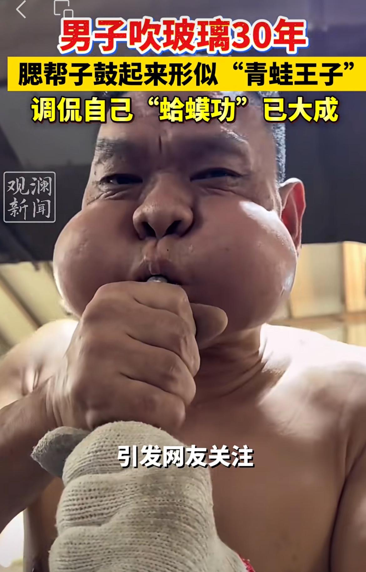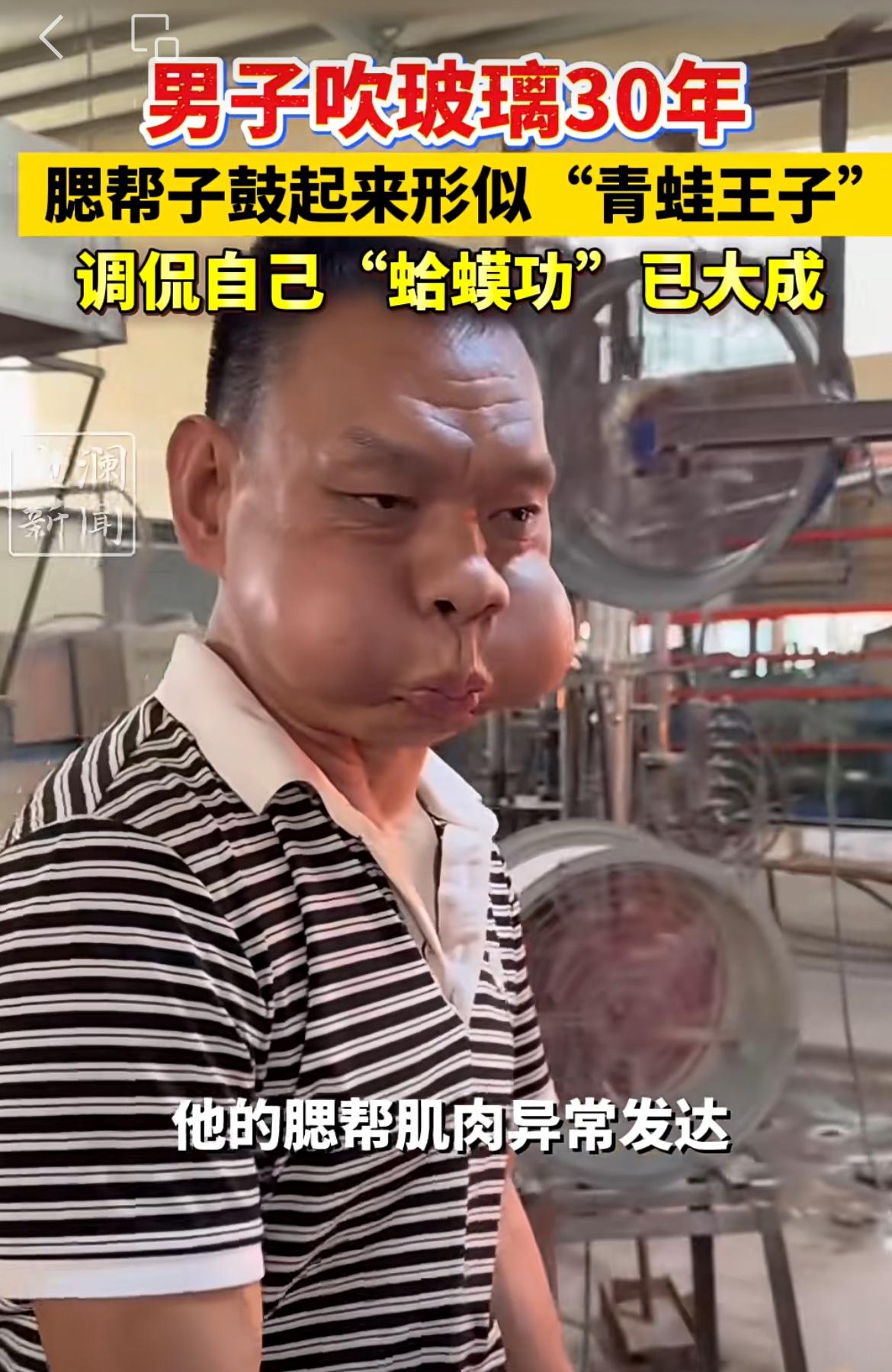 广东一男子腮帮子如皮球,吹玻璃走红,被网友戏称青蛙王子。该男子是一个玻璃工艺瓶厂员工,日常工作就是制作玻璃制品,有一道工艺就是吹填玻璃,形成空腔,达到造型和定型的目的。男子天天吹,持续30年,腮帮子练就了发达的肌肉,鼓起气来形成的气腔要比一般人大很多,看起来特别像青蛙生气的样子。碎嘴子男孩 吹玻璃高手 玻璃吹制