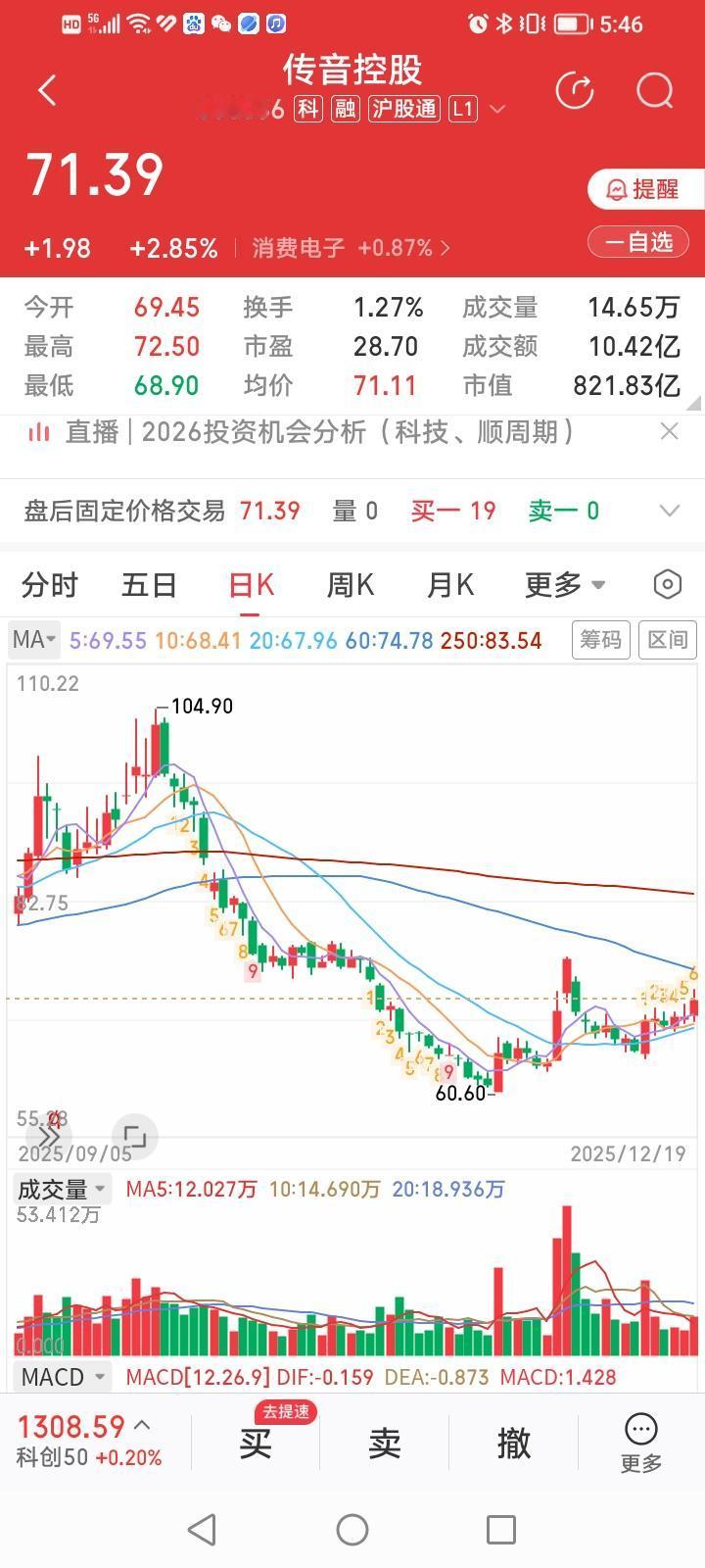完犊子了!股市行情变天了。宝钛股份、万华化学、传音控股这三只长期观察,没敢建仓的冷门股近几天竟然莫名其妙涨势如虹,令我无所适从。 前几天看重庆卫视的《谢谢你来了》栏目,里面说到钛合金具有抗腐蚀性、抗菌性、亲生物性等优异特性,就把宝钛股份加入了自选股,但看它市盈率高达四十多倍,三季报业绩下滑40%以上,就没敢建仓,谁知这几天股价竟然涨疯了。 化学茅万华化学也是怪我复盘不认真,在双底铸成时没敢加仓,错失了加仓的最佳时机。 传音控股是目前A股唯一一家做手机整机的上市公司,股价从103元跌到60元左右时竟然没敢建仓。现在也不敢动了。 收紧拳头,长期观察,对双底铸成的低估股票可以分期逢低建仓。