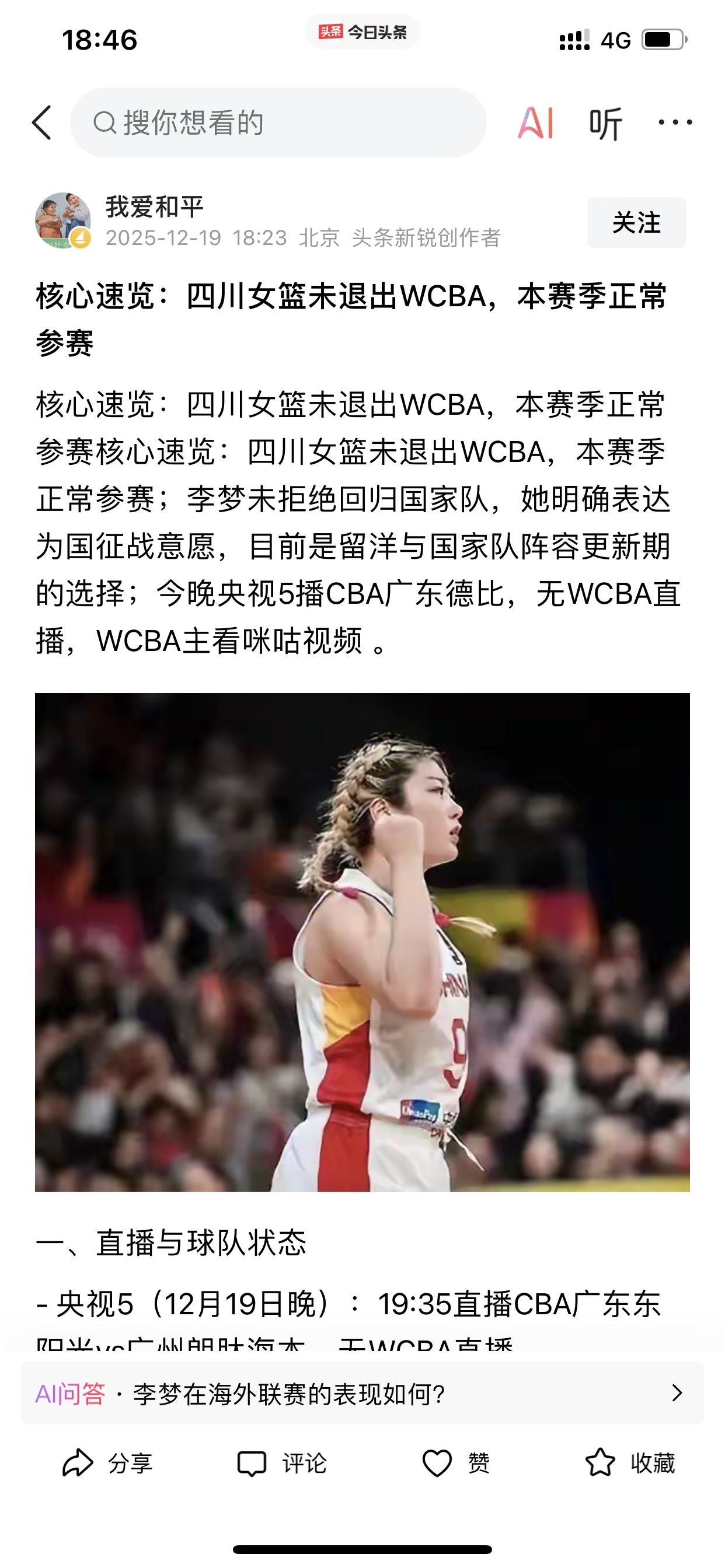 竟有人发微头条说四川女篮没退出WCBA? 到底是怎么了?何来此说法? 这内容是2025年12月19日晚18:23分发布的! 我完全想不通为什么会有人发布这样子的微头条?而且还是WCBA2025-2026赛季都打到第七轮了 可见不少人压根就不看WCBA,也不管自己发布的信息到底有多离谱,完全就是一个目的,即赤裸裸的蹭流量,毕竟四川女篮这四个字在篮球领域还是有很大吸引眼球的地方! 其实,我还是我自己在微头条说过多次的话👇 即蹭谁的流量很正常,而这个人是蹭四川女篮,那么它至少自己得去关注这个赛事,不能凭空臆造啊!