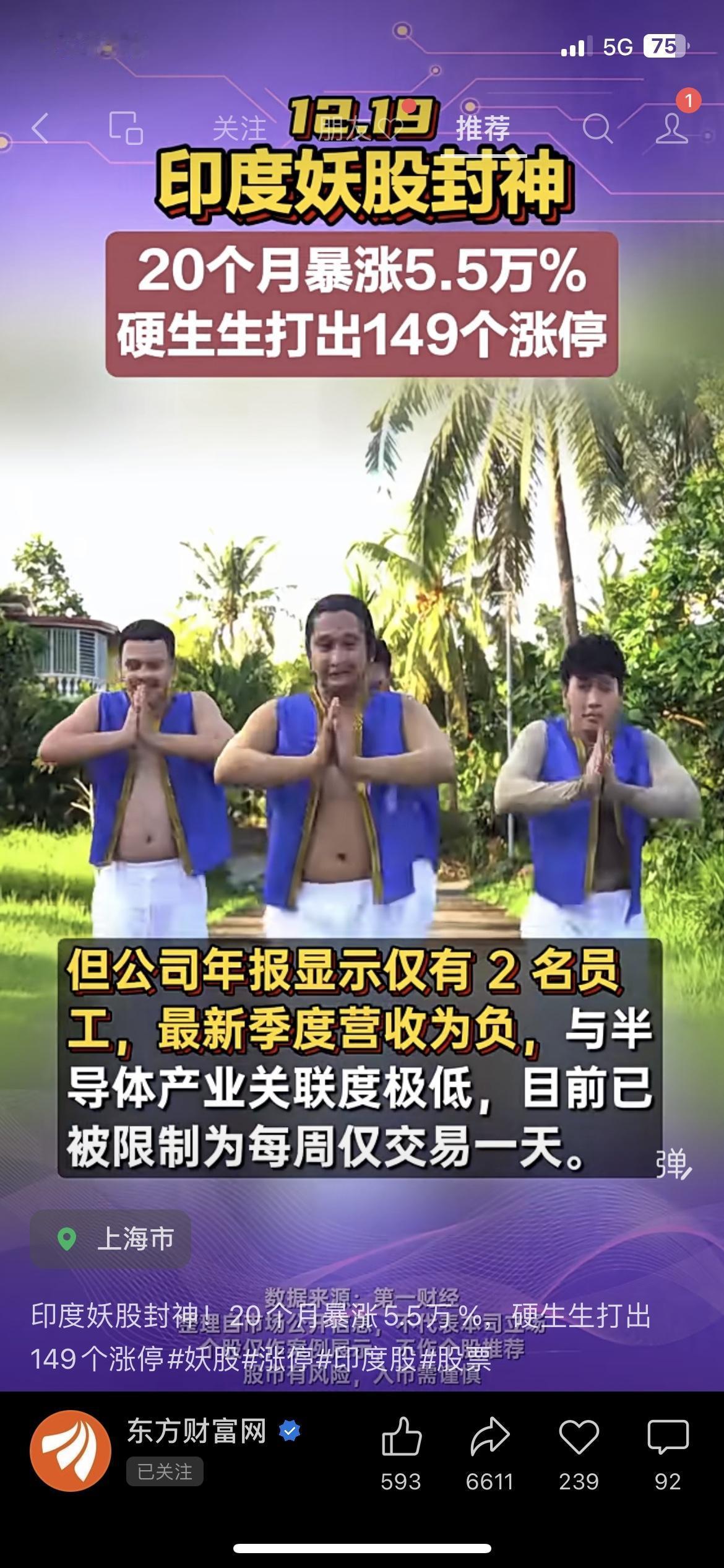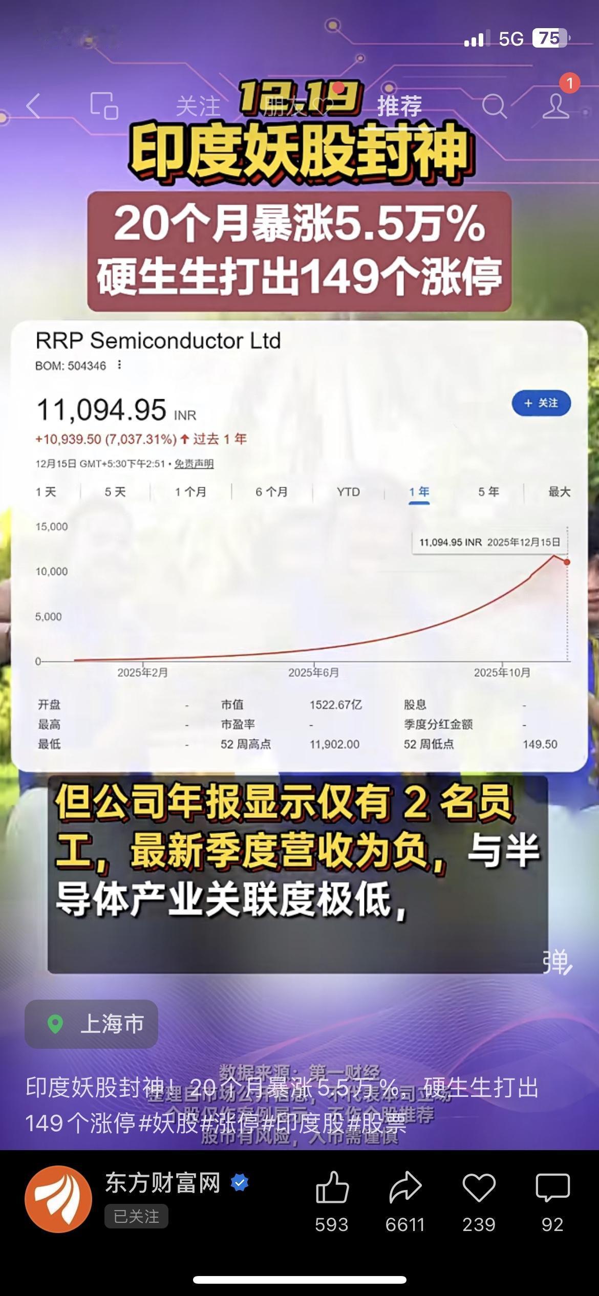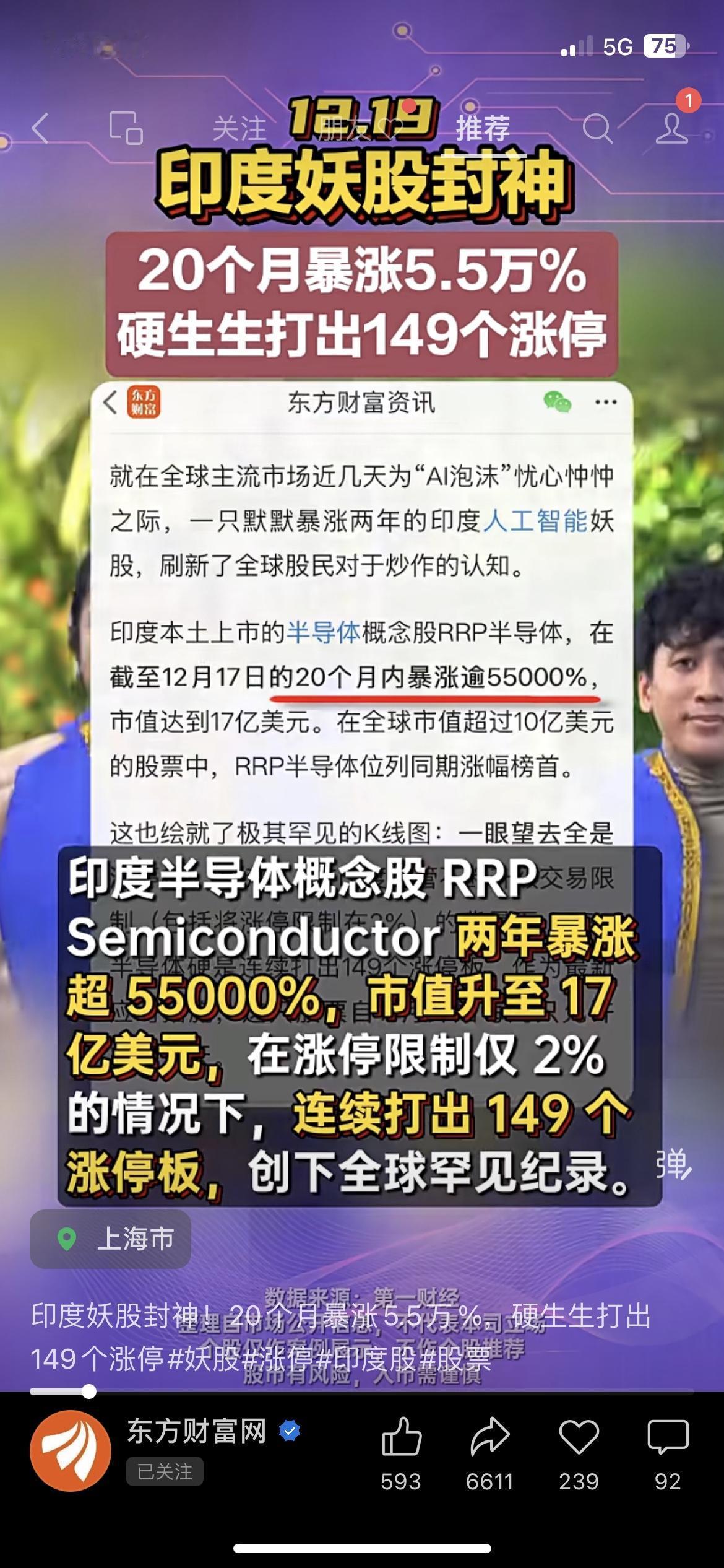 🇮🇳印度妖股疯了!20个月暴涨5.5万%,2个员工造出149个涨停 上海股民老杨盯着K线直骂:“这股比彩票还离谱” RRP半导体营收为负、和半导体八竿子打不着 现在被限每周只交易一天,散户敢冲的都是真勇士? 你敢买这种“空壳妖股”吗?妖股板块