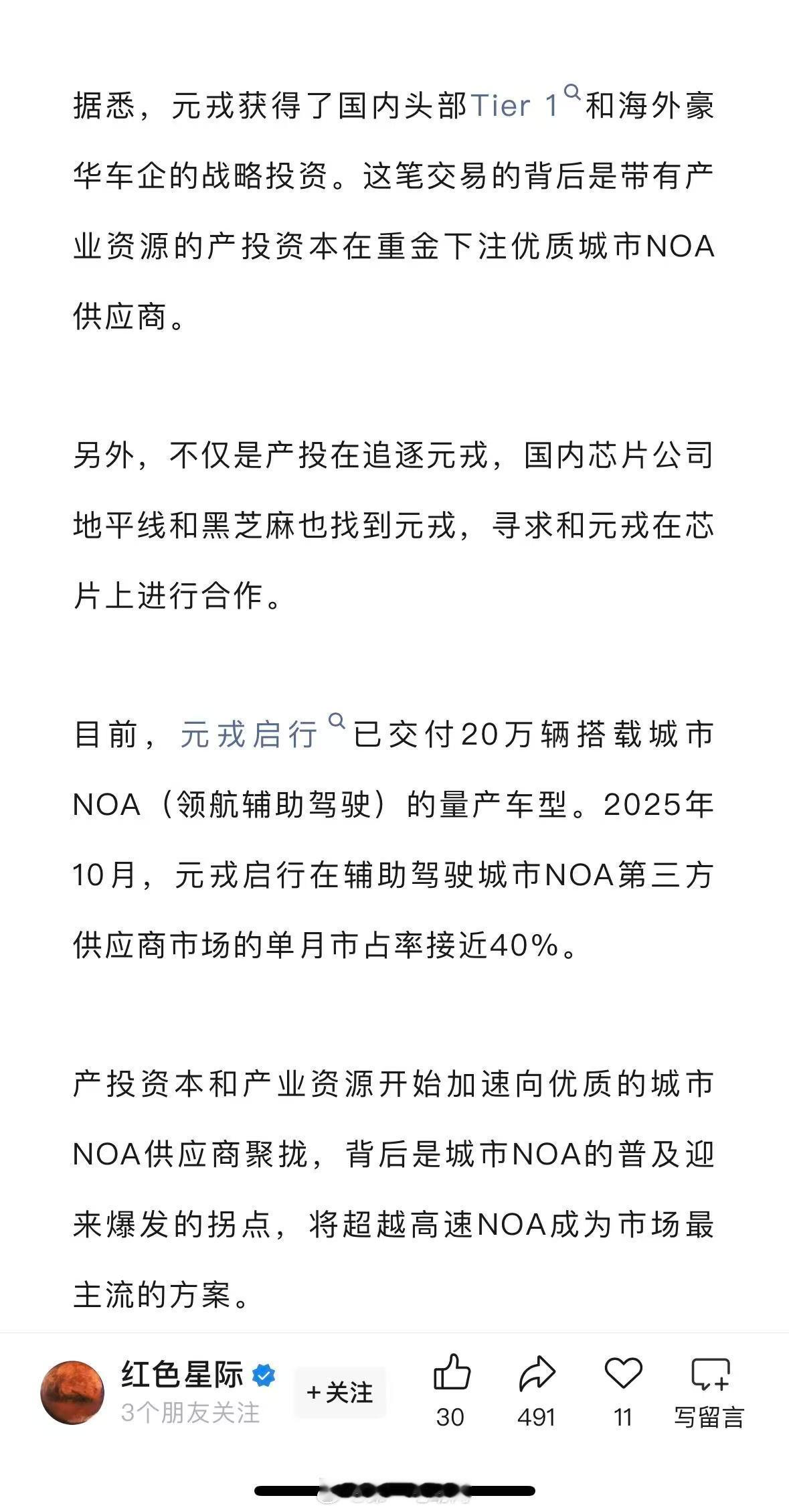 据红色星际消息,元戎启行迎来密集利好:获国内头部 Tier 1 与海外豪华车企战略投资,地平线、黑芝麻等芯片厂商主动寻求合作。城市 NOA 已累计交付 20 万辆,单月市占率接近 40%,成为该赛道增速最快的供应商之一。随着城市 NOA 成本下探、规模放量在即,行业正加速走向“华为、元戎、Momenta 三分天下”的关键阶段(地平线应该也加上一个)目前元戎启行的方案车型只有魏牌蓝山参加了我们的第二届智驾大赛 ,期待明年更多车型加入战局 元戎启行智能驾驶