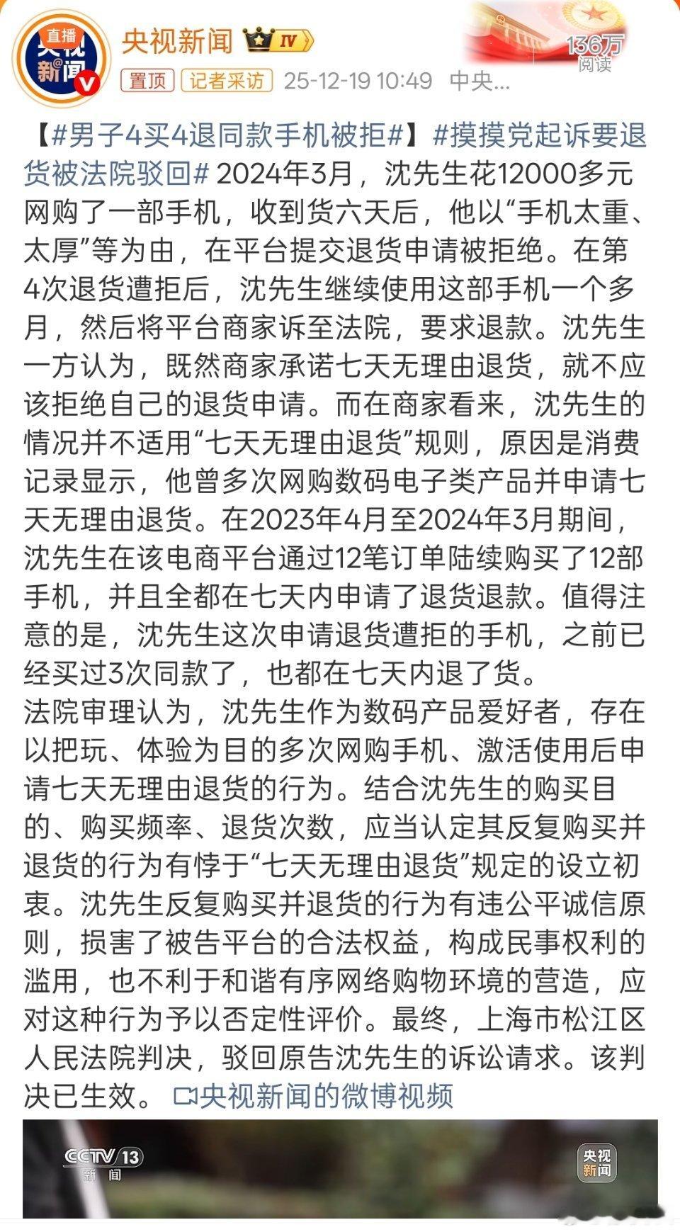 男子4买4退同款手机被拒“曾多次网购数码电子类产品并申请七天无理由退货”,这操作让人想起一位数码大V,以及一位曾经的手机厂商美女产品经理。