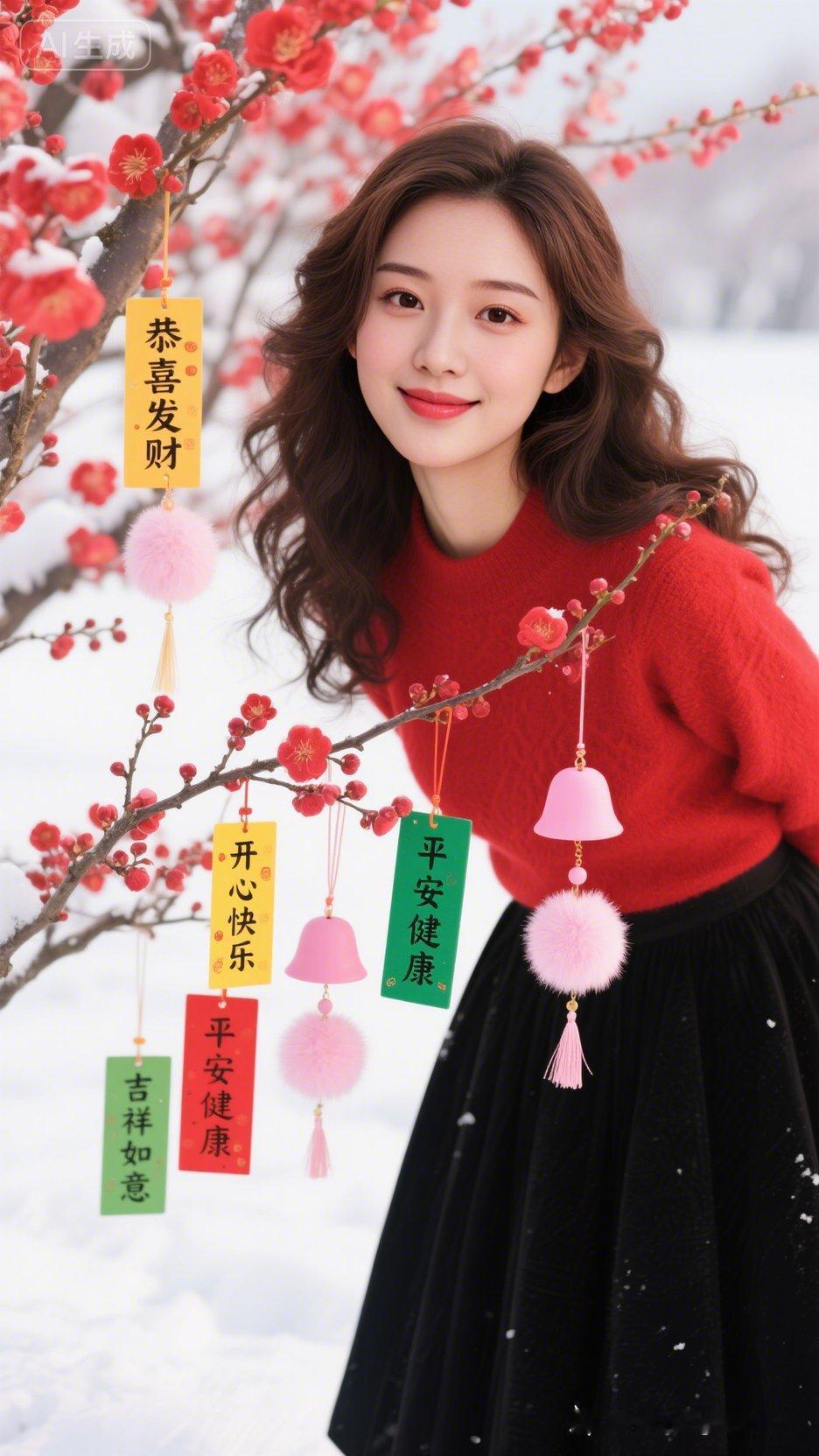 冬日暖阳下,红衣少女与花枝招展的祝福语,新年快乐!🌸🎉