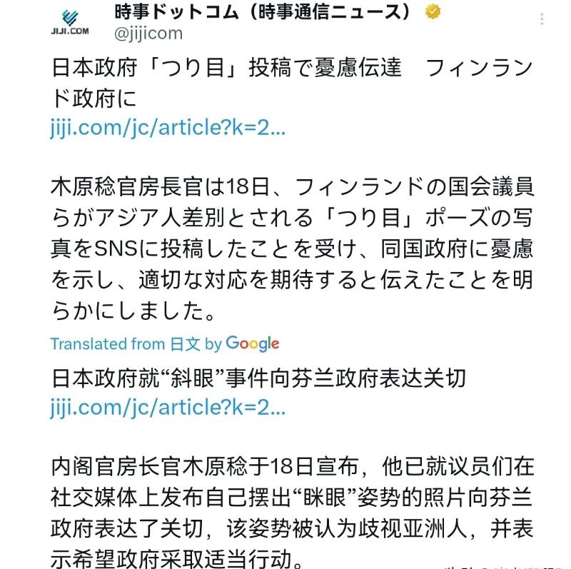 不得不说,日本这事干的还是非常漂亮!在芬兰小姐萨拉·扎夫斯发布眯眯眼视频,其后芬兰国会议员跟进该行为之后,日本出来回应了!12月18日,日本官房长官木原稔表示,针对芬兰国会议员等人在社交平台发布被认定为歧视亚裔的“眯眯眼”摆拍一事,日方已向芬兰政府表达关切,并期待芬方作出妥善处理。 今年9月刚加冕的芬兰小姐萨拉·扎夫斯,在社交平台发了张自拍照,照片里她用手指把眼角往两侧拉扯,做出典型的“眯眯眼”模样,配文还是“和中国人吃饭”。 消息一传开,立马就有亚裔群体提出抗议,指出这个动作是长期用来丑化东亚人的歧视行为。面对批评,扎夫斯先是辩解说是头痛按摩太阳穴,又甩锅给朋友说是对方加的配文,直到舆论压力越来越大,才不情不愿地道歉。 原本这只是个人的不当言行,选美组织也迅速表态,直接剥夺了她的冠军头衔,把头衔转给了亚军,按理说事情该告一段落了。可谁也没想到,芬兰的几位政客竟然跳出来“声援”扎夫斯。 来自芬兰右翼政党的多名议员,包括尤霍·埃罗拉、凯莎·加雷德等人,纷纷在社交平台发布自己模仿拉眼角的照片,甚至有人把这种照片设成了社交账号头像,还配文“我是莎拉”,声称觉得对扎夫斯的惩罚太严厉。 政客的跟风彻底让事件升级,毕竟个人行为和政治人物的公开表态性质完全不同。这波操作不光让中国网友愤怒,在日本和韩国也引发了强烈不满,不少日本网友直言“这就是赤裸裸的种族歧视”,还有人发起了在线请愿,呼吁调查反亚裔歧视现象。 就在舆论持续发酵的时候,日本官方给出了明确回应。12月18日,日本官房长官木原稔表示,已经就芬兰国会议员发布歧视亚裔摆拍一事,向芬兰政府表达了关切,并且期待芬方能够妥善处理。 不得不说,日本这次的表态很有意义。要知道,在很多国际议题上,东亚各国之间难免有分歧,但在反亚裔歧视这件事上,大家的立场高度一致。因为这个拉眼角的动作,针对的从来不是某一个国家的人,而是所有亚裔群体。 早从19世纪“黄祸论”兴起开始,西方就开始刻意丑化亚裔形象。大家熟知的“傅满洲”形象,就是最典型的代表,眯缝眼、八字胡,被塑造成邪恶、愚昧的化身。而拉眼角做“眯眯眼”的动作,就是把这种刻板印象具象化,本质上是在延续这种侮辱性的认知,把亚裔和“低等”“怪异”绑定在一起。 更让人无法接受的是,芬兰这些政客明明知道这个动作会冒犯他人,却还要刻意模仿,甚至把这当成“表达立场”的方式。这种行为背后,是对其他种族的不尊重,更是一种深入骨髓的西方傲慢。 值得一提的是,面对中日韩等国的强烈反应和民间的抵制呼声,芬兰总理也不得不出面灭火,公开表示“绝不接受任何形式的种族主义”,还让驻中、日、韩的使馆用三国语言发布道歉声明,试图挽回受损的国家形象。 芬兰航空更是早早表态,赶紧和这些政客的行为划清界限,明确表示这些言论不代表公司价值观,因为他们已经感受到了实实在在的压力,收到了不少抵制芬兰航空、拒绝去芬兰旅游的留言。 这也给我们提了个醒,面对种族歧视,沉默和退让是没用的。只有大家都站出来表达立场,让对方感受到代价,才能让这些傲慢的歧视者正视问题。就像这次的事件,如果没有亚裔群体的集体发声,芬兰官方可能根本不会这么快表态道歉。 其实这些年,类似的歧视事件并不少见,从品牌广告里的刻意眯眯眼妆容,到日常生活中的不当言论,偏见一直都在。但变化是,越来越多的亚裔开始主动站出来维权,不再默默忍受。 因为大家渐渐明白,尊重不是靠别人施舍来的,而是靠自己争取来的。每个亚裔的发声,都是在为自己、为整个群体争取应有的尊严。这次日本官方的表态,也让我们看到,反亚裔歧视从来都不是一个国家的事,而是整个亚裔群体的共同课题。 现在芬兰总理已经道歉,涉事政客却还没有给出让人满意的回应。这场风波最终会如何收场,还需要看芬方后续的实际行动。但无论结果如何,这次事件都给所有种族歧视者提了个醒:时代已经变了,亚裔不会再为你们的偏见和傲慢买单。